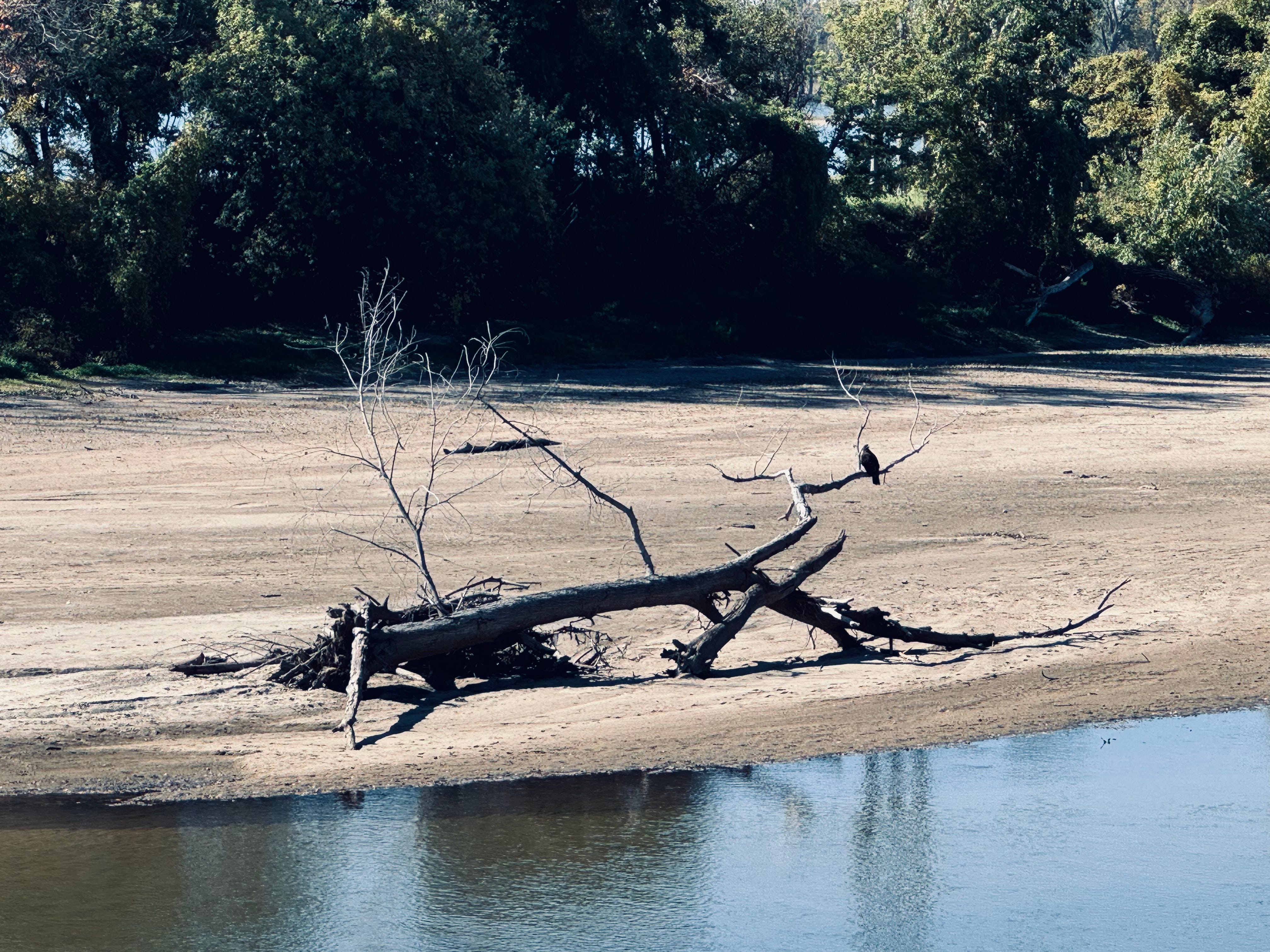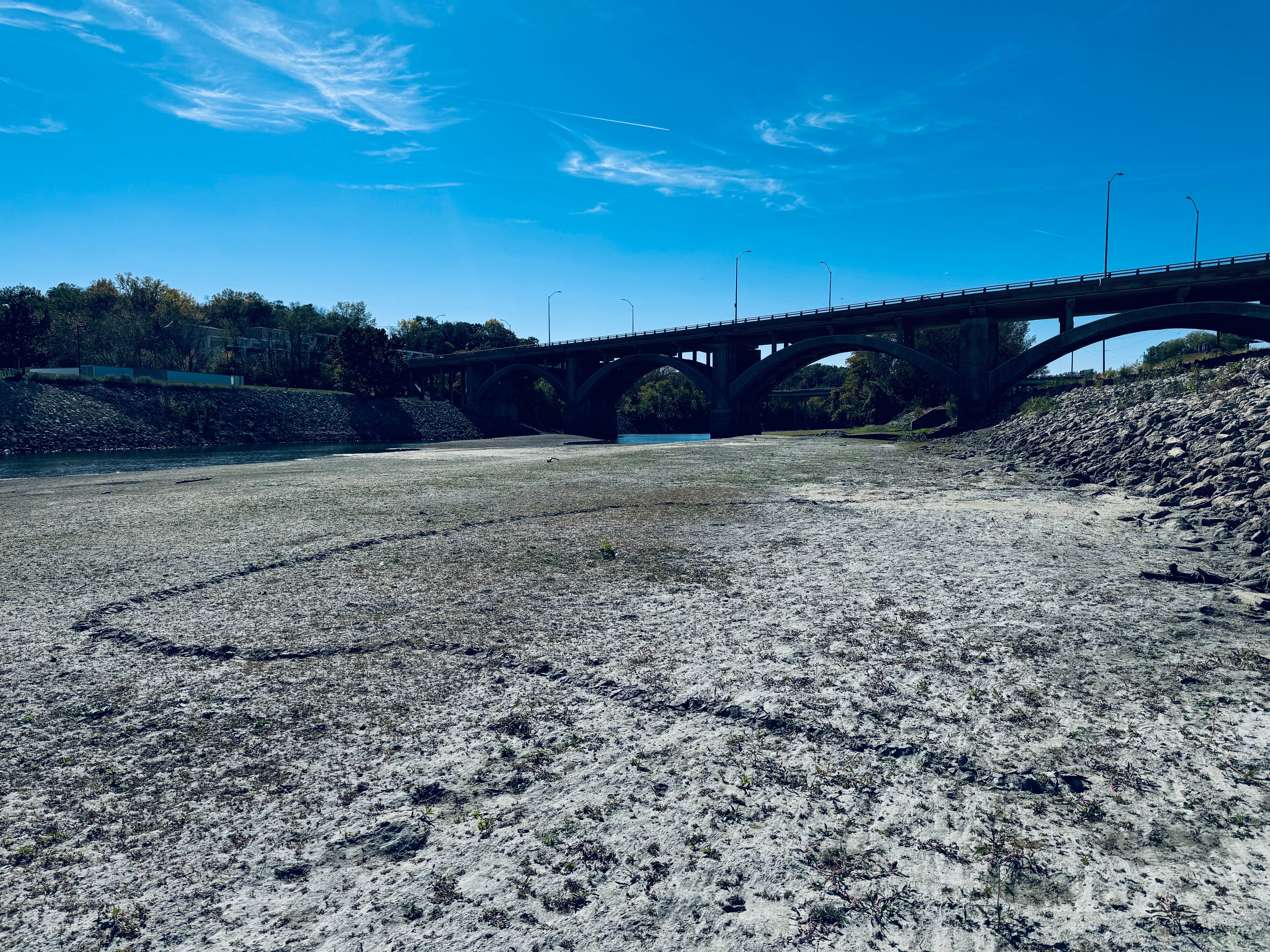 The urbanity disappeared quickly, even though it was all around. There were shoals visible in the river, and rapids. Inland gulls flying, and a septet of turkey vultures on the opposite bank, the gold dome of the Capitol visible behind them. The river was leaving downtown, through the Southeast Bottoms, the floodplain around the confluence that has always been a half-abandoned zone. There’s a ball park there, where the farm team for the Chicago Cubs plays, but you can’t see it from that riparian sidewalk at the edge. You could only see the signs of recent campfires overnighters had built on the path, and a dude fishing in the rapids as his companion watched from the higher deck.
