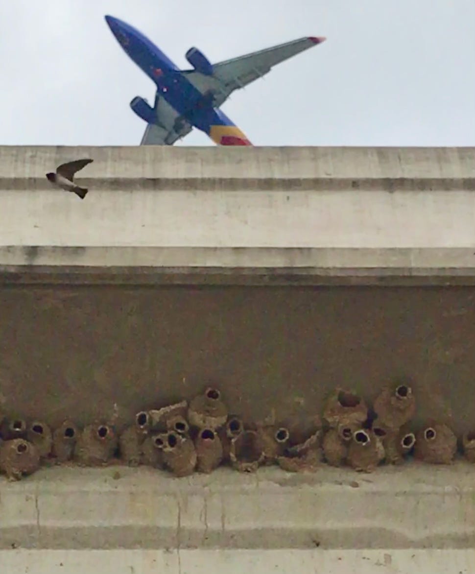 They were zipping all around us, banking and diving, cutting through the muggy air and giving the brutal infrastructure a sense of life. I recognized the birds, or at least their general type. We’d had them in Des Moines when I was a kid—I remembered being buzzed by swallows when my buddies Ben and Phil and I figured out how to climb up on top of our middle school on summer evenings, before we advanced to churches. But I’d never noticed their nests. Maybe because that was before the 1980s, when cliff swallows were first observed to have started using the concrete nooks under our elevated roadways as one of their preferred sites to make their little pustules of dappled mud, giving our most brutal and ubiquitous alterations of the fossil fuel-era landscape an organic wonder they did not earn.