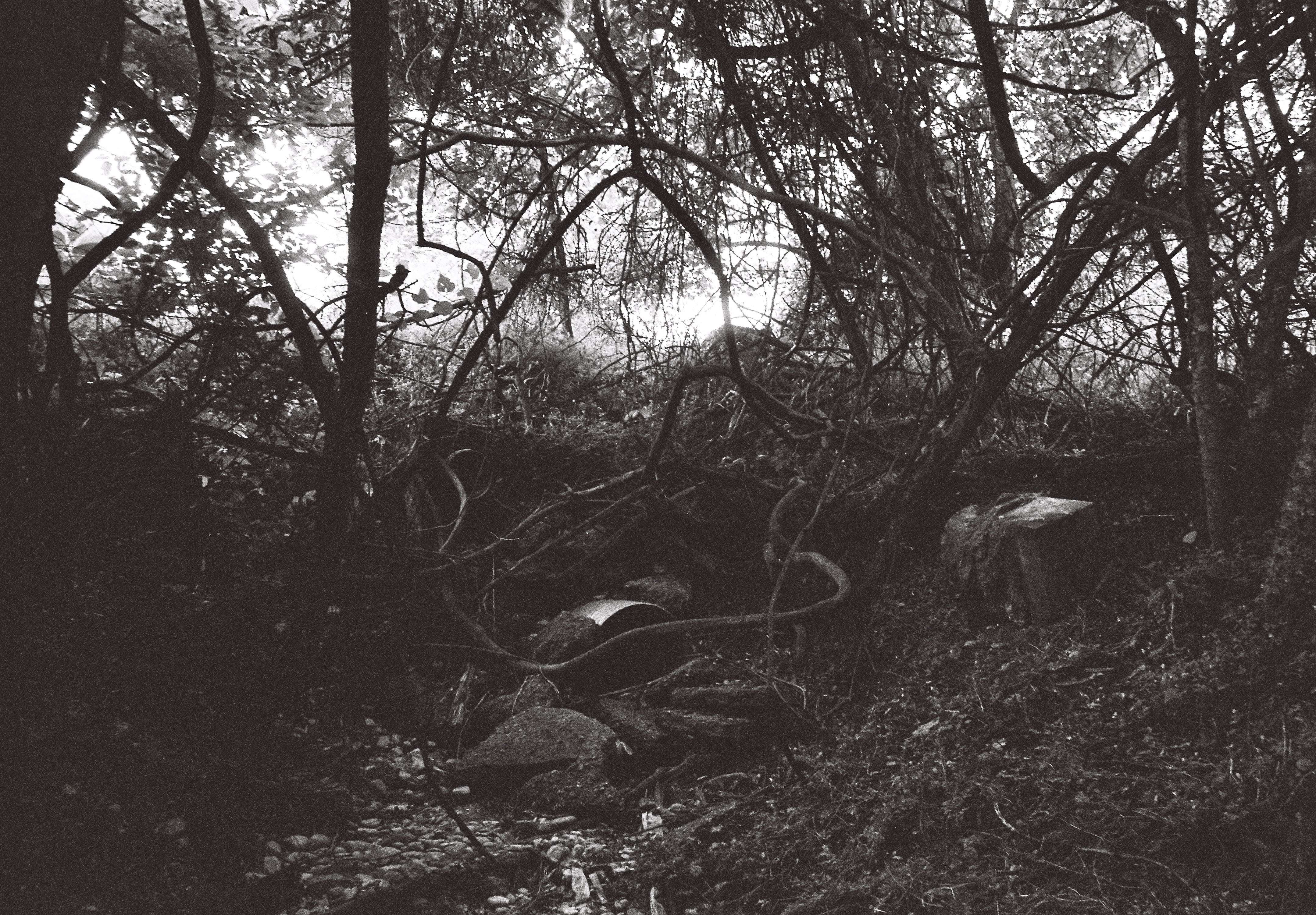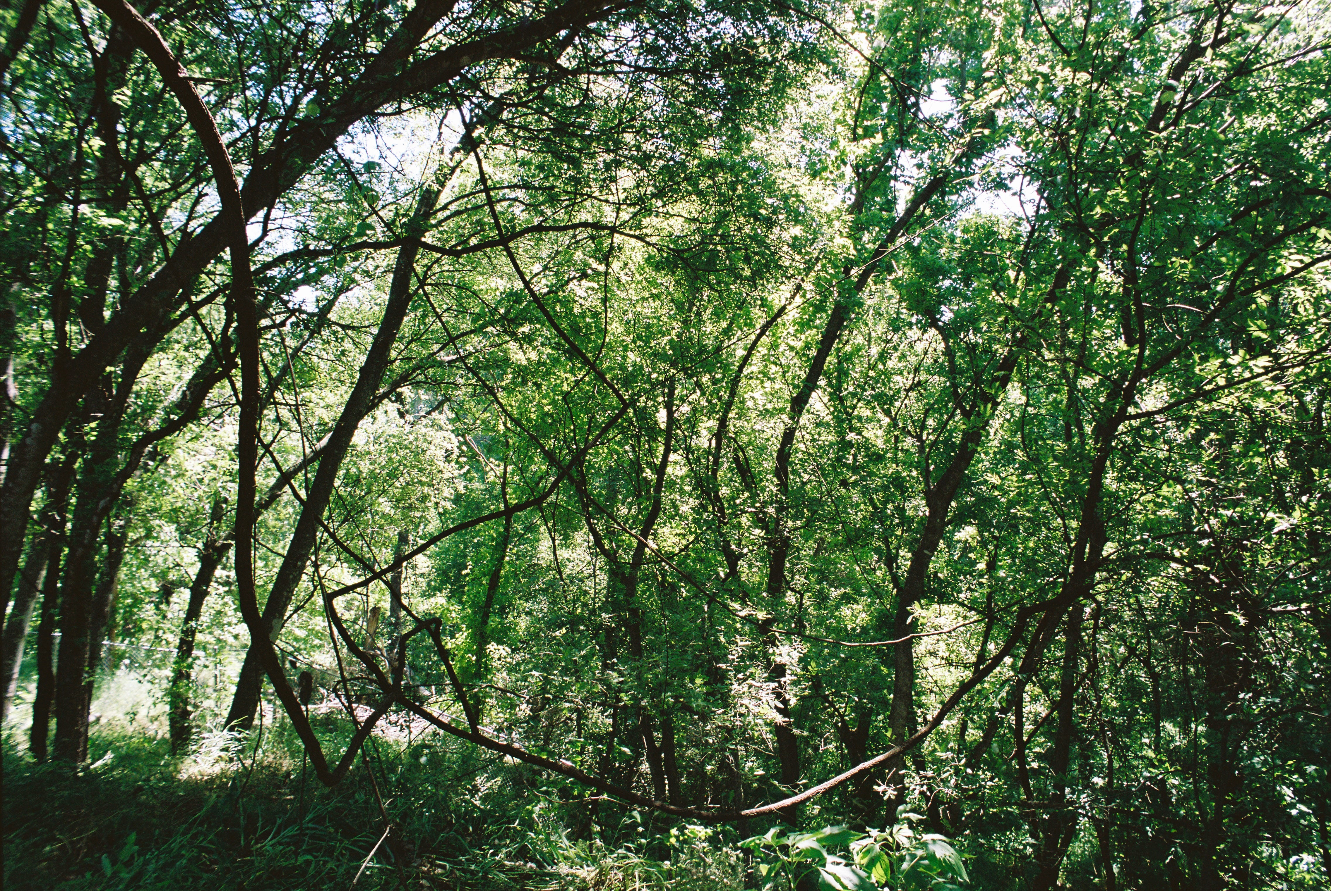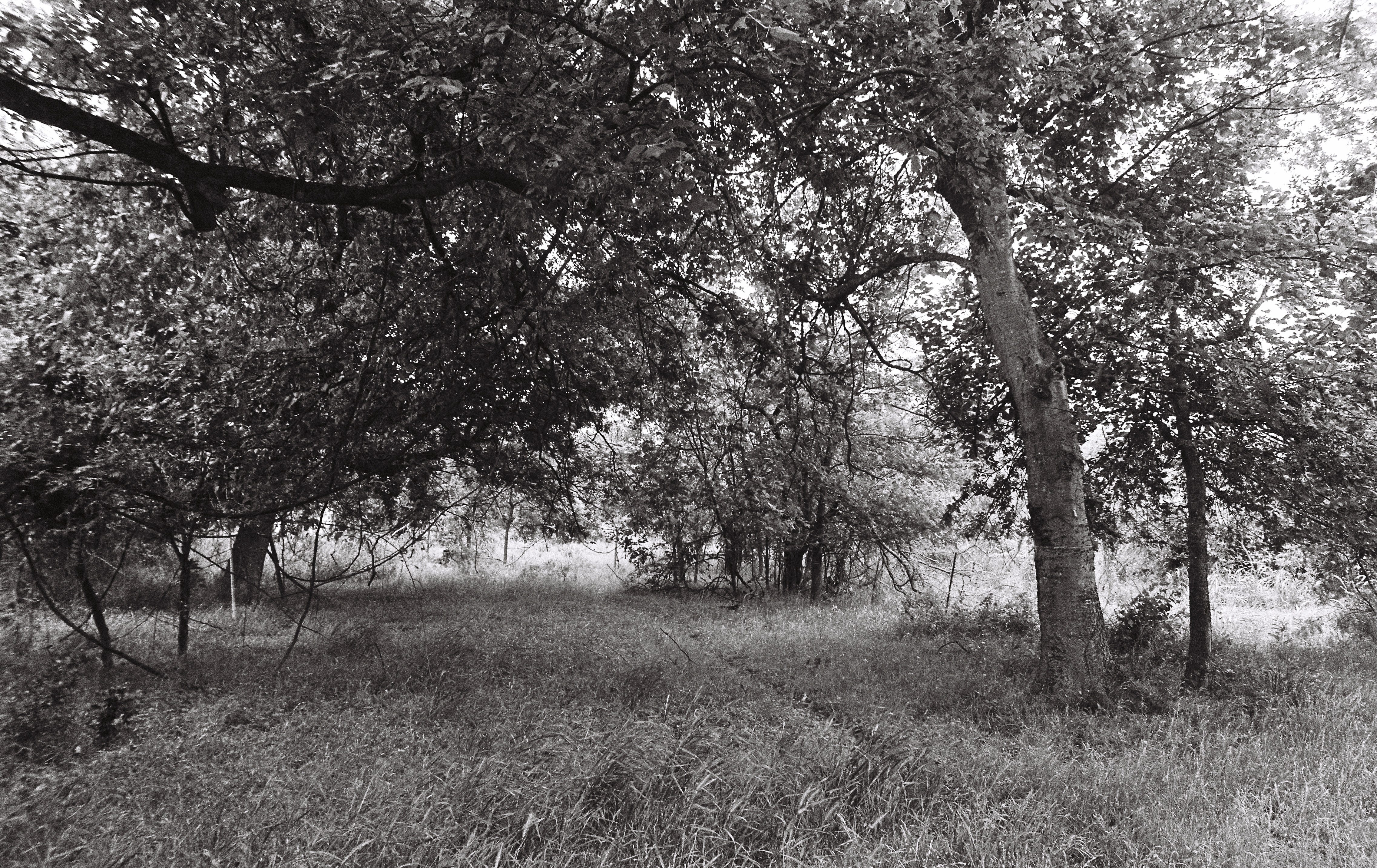 Back behind the industrial park at the base of the tollway onramp, there is a strange zone where wild nature has mostly recovered what was, a century ago, the route of a road that led east out of town. You can get there walking on publicly-owned land, but to do so you would have to find your way almost by accident, through urban woods and empty lots hidden behind hurricane fences garlanded with barbed wire. In one spot, where the old rights of way converge behind the construction supply warehouse, a thick patch of scrubby woods grows up around a drainage ditch. An interstitial woods so tiny in terms of actual square footage that, if it were cleared, you would pass it in a dozen steps. But come summer, the foliage is so dense that the only way through is to get down on all fours and crawl through the tunnels the animals make. (Yes, I have, in case you are wondering.)