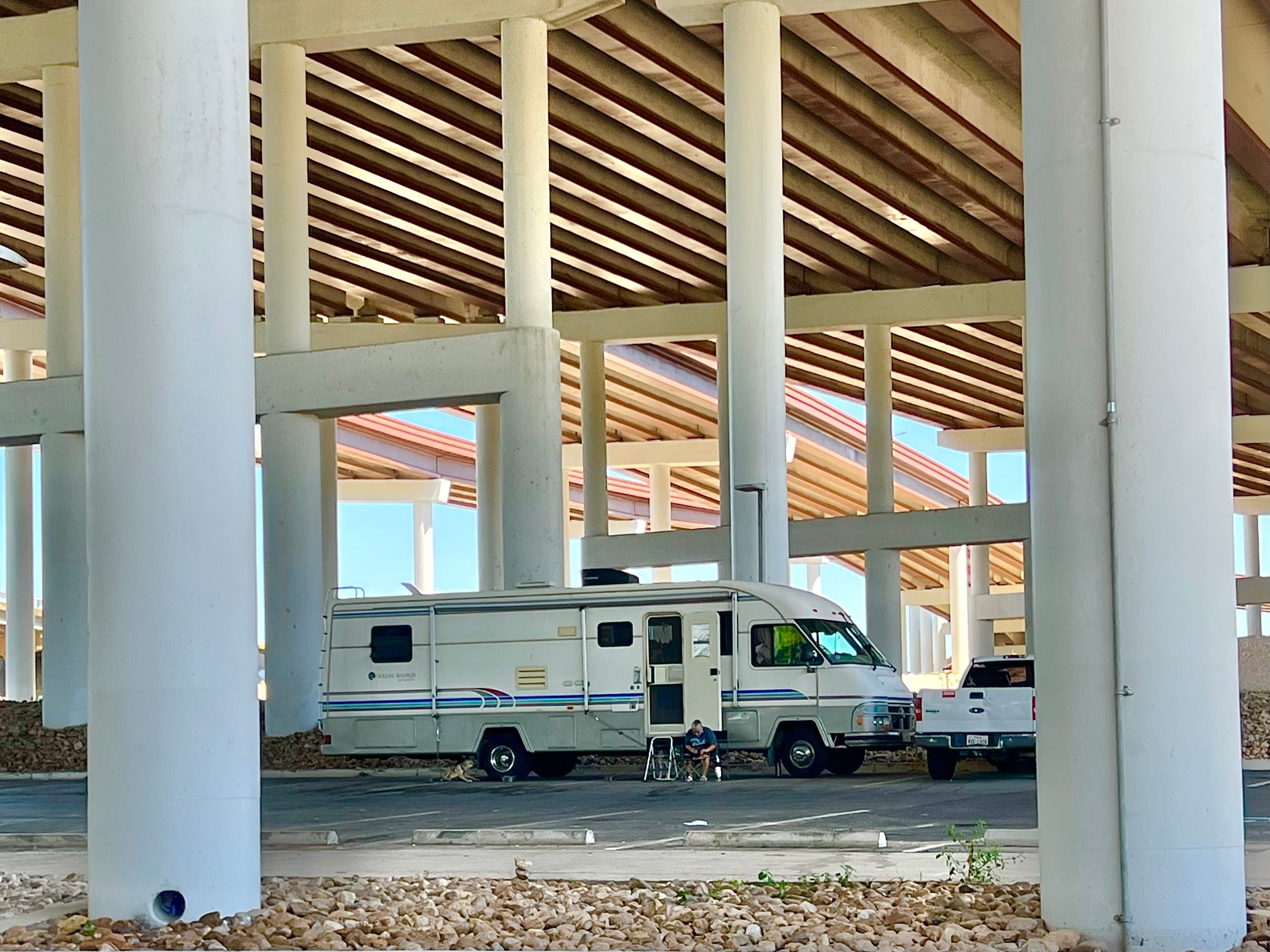 I had an audience of two watching me as I watched the scooter. A grey-haired petro-nomad hanging out with her dogs in a lawn chair outside the screen door of her Holiday Rambler, which has been parked there under the bridge for a few weeks now, and a younger lady in a green cotton dress who looked like she had probably just walked up from one of the camps in the nearby woods. She sat on the concrete shelf as I worked my middle-aged body through my last sets at the calisthenic stations the mobility authority installed last fall. We all three turned our heads when the first real angler showed up, rumbling off the bike lane in an ATV augmented with orange fishing poles tied to the rear like whip antennas.