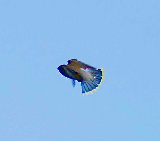 When our Kishu dog was just a puppy who seemed part wolf and part Pokemon, my wife caught him with a live bird in his mouth. She tried to get him to release it. When she came for it, his response was to swallow it, whole, even though that seemed physically impossible. I was at my office, and when she called to tell me and I asked her what kind of bird it was, she gave a description that made it sound like some kind of oriole. Now I wonder if maybe it was a waxwing.