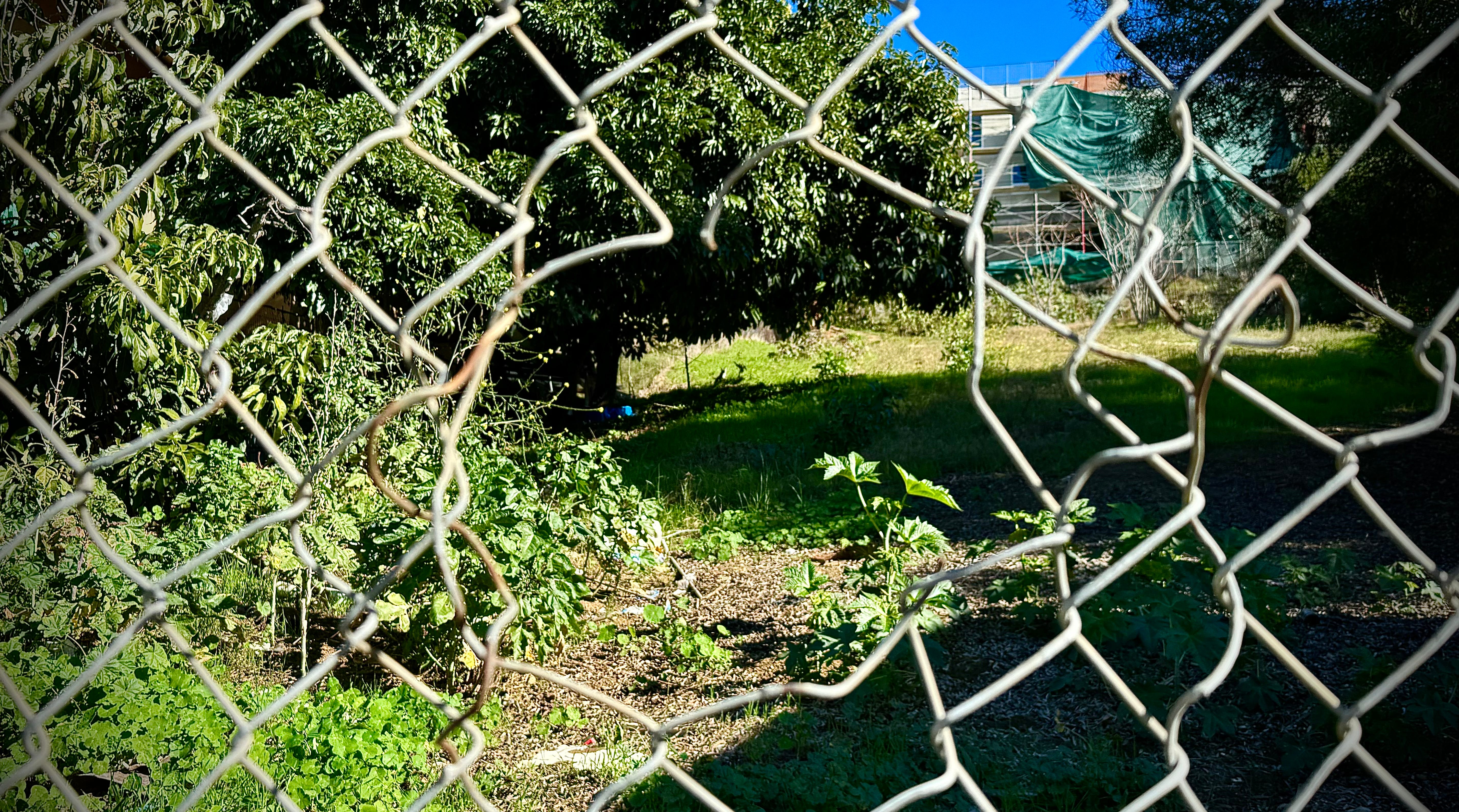 When I looked through the hole in the chainlink, thinking about sneaking in, the cat lounging back in the weeds warned me off.