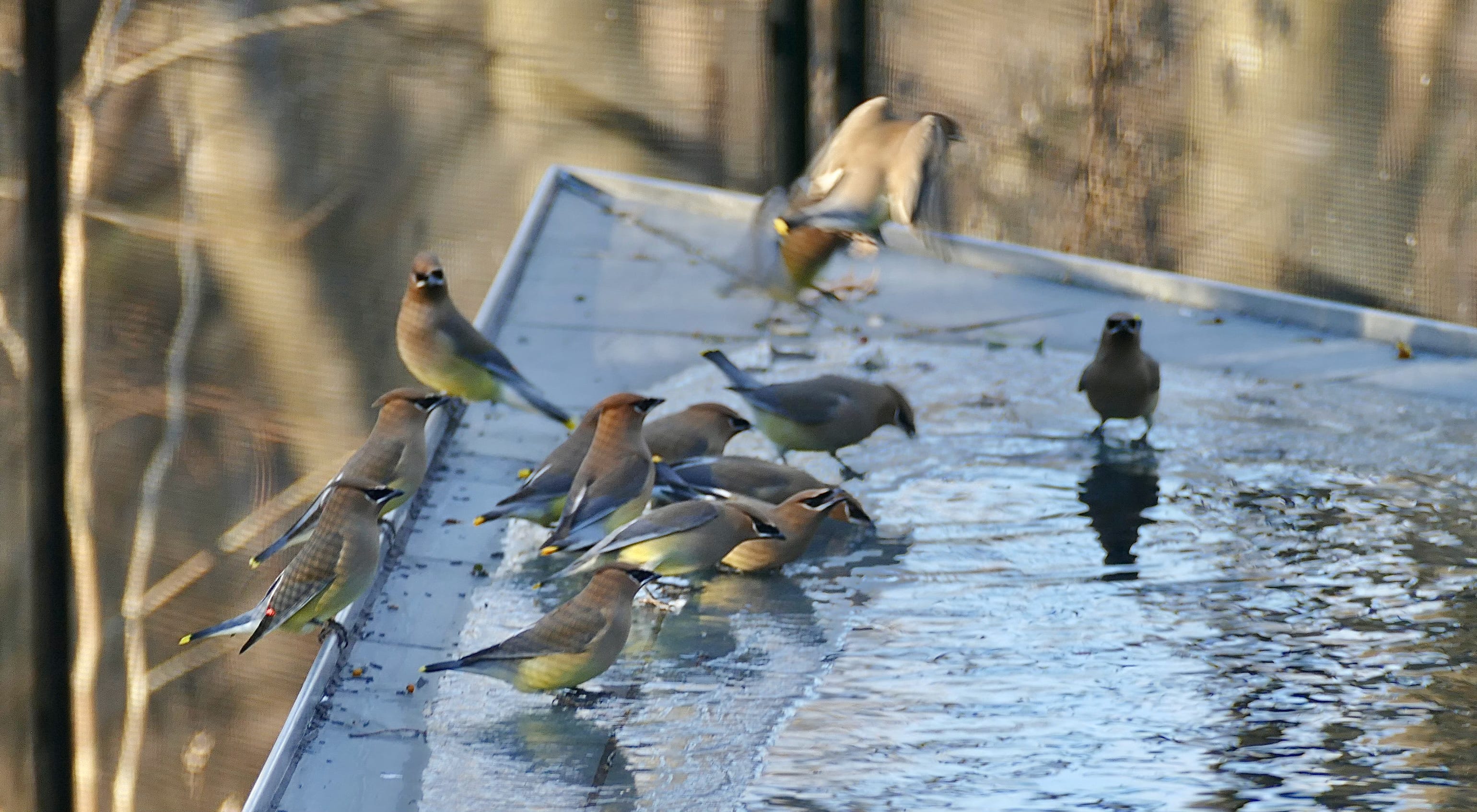 Cedar waxwings are not a rare bird, but they are a special one to me. One of the first wild birds I ever learned to pay attention to, one summer day in Iowa City as I finished law school, in an experience that helped me learn to appreciate the everyday wonders of the wild nature we share our cities with. And one of the happy surprises of this weird little home we made at the edge of the urban woods is how, every winter, the waxwings come back to our place for a pool party.