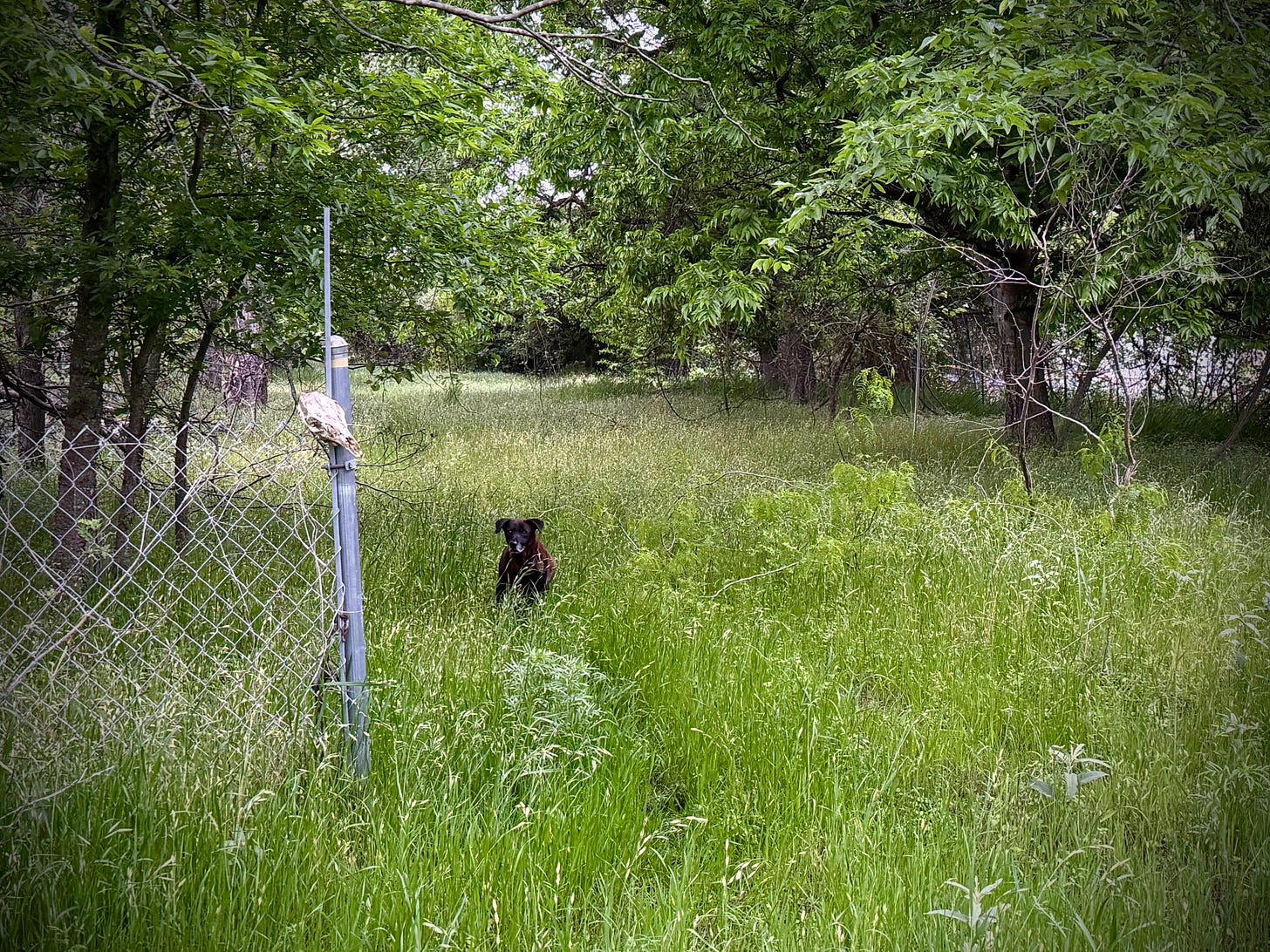She’s 14 this year, so maybe she’s officially had enough with these walks into territories where her wild coyote cousins still hunt and kill their food. Or maybe the way the deer’s skull was now hanging on the fence post creeped her out. So I followed her home, let her in, and headed back out solo.