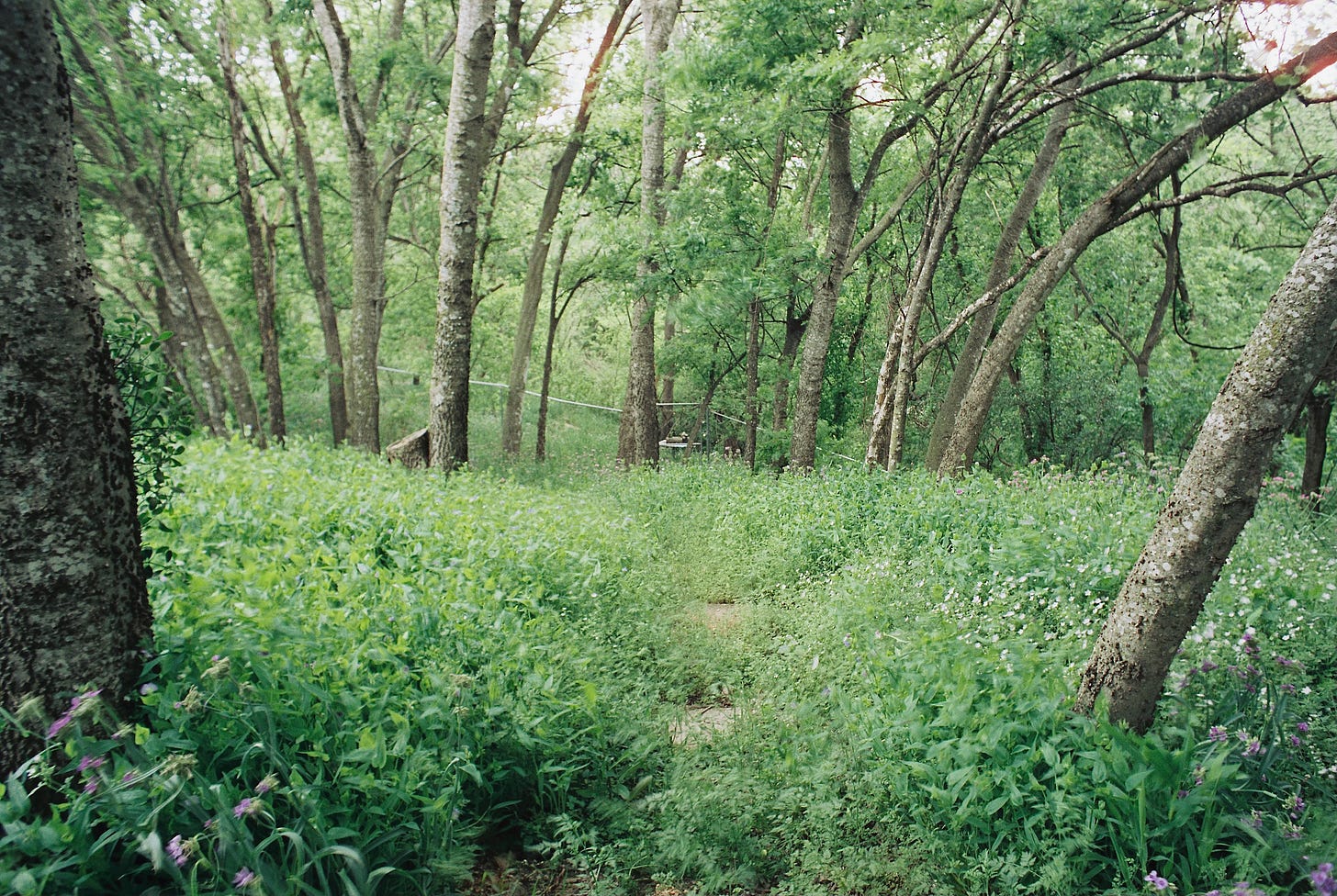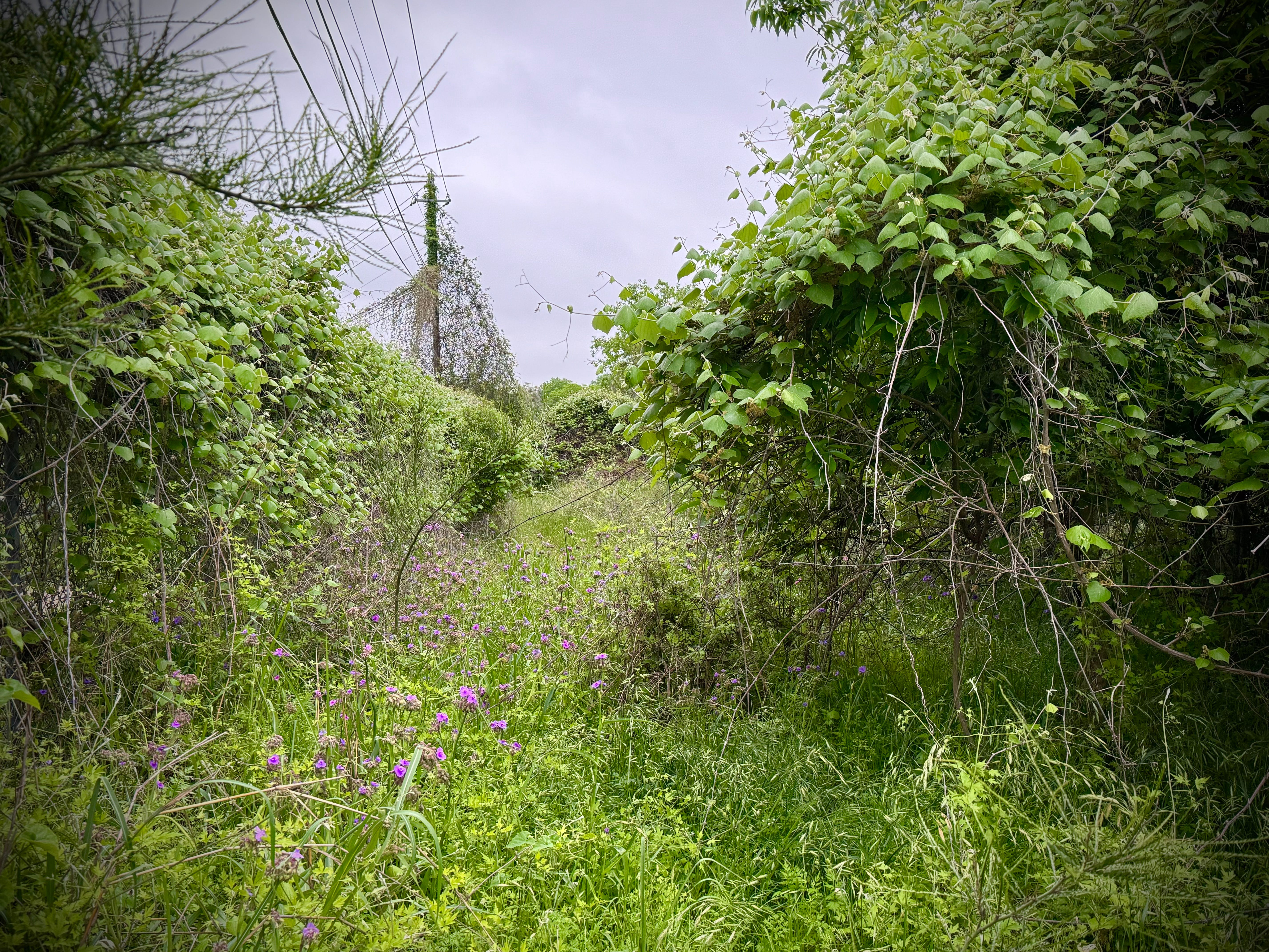 The zone behind the factories gets especially feral in spring, almost impassable in spots. You can see the traces of the paths made by deer and foxes, and you can follow them, if you accept the fact that you may need to crouch, or crawl, into foliage tunnels no biped has entered before. It’s a blessing that ticks are rare here, for reasons I have not yet divined. Chiggers are not, nor are snakes, but you learn to dress for both.