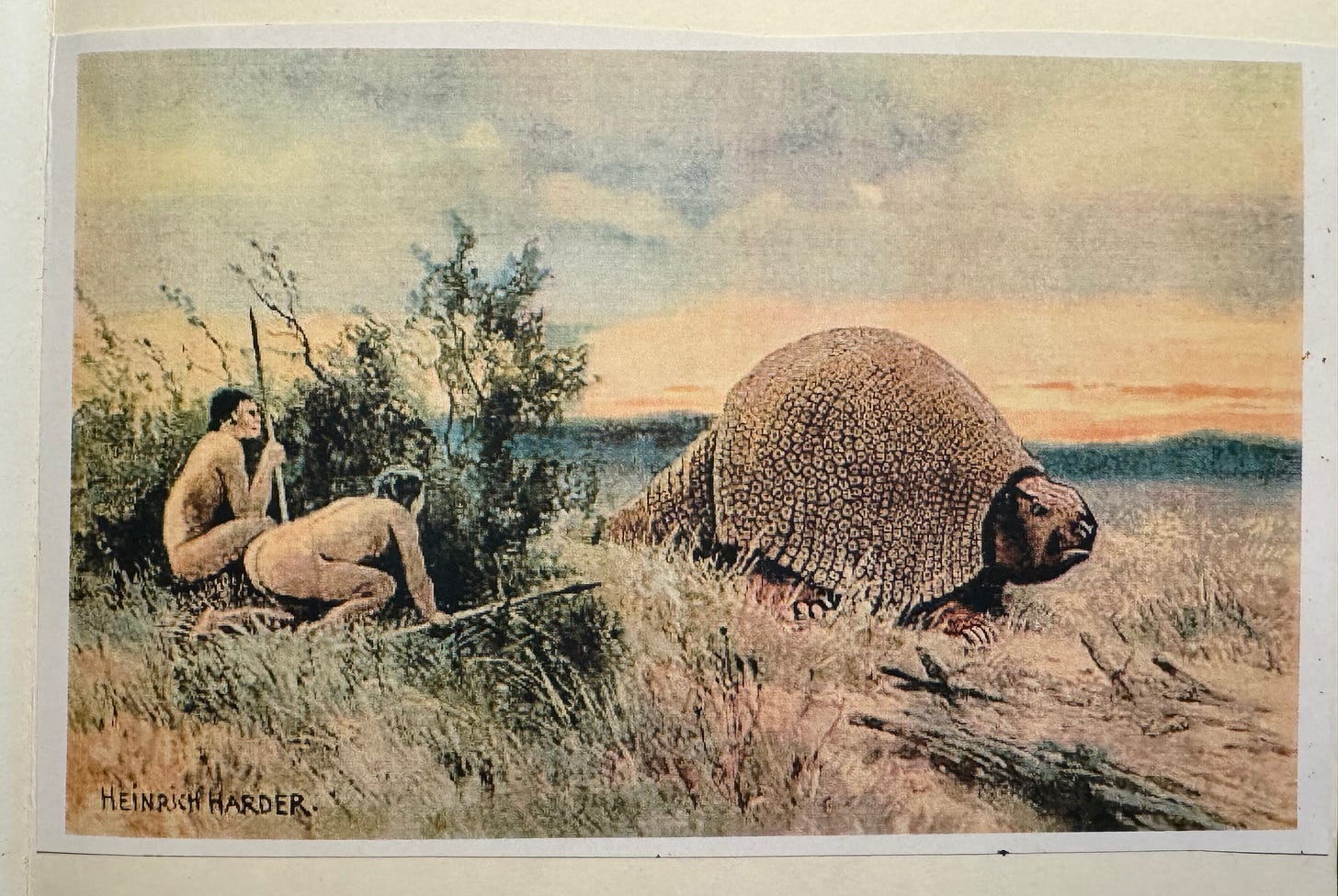 The natural historians surmise that prehistoric armadillos migrated into South America before the Isthmus of Panama submerged around 65 million years ago, and there diversified into an abundant variety of armored foragers. They were able to return to this continent in the late Pliocene, a few million years ago, and for a period they had that epic status—from Dasypus bellus, the “beautiful armadillo,” three times the size of of its contemporary cousins but otherwise largely identical, to the Glyptodons, who were the size of a car. We know how that turned out in the end.