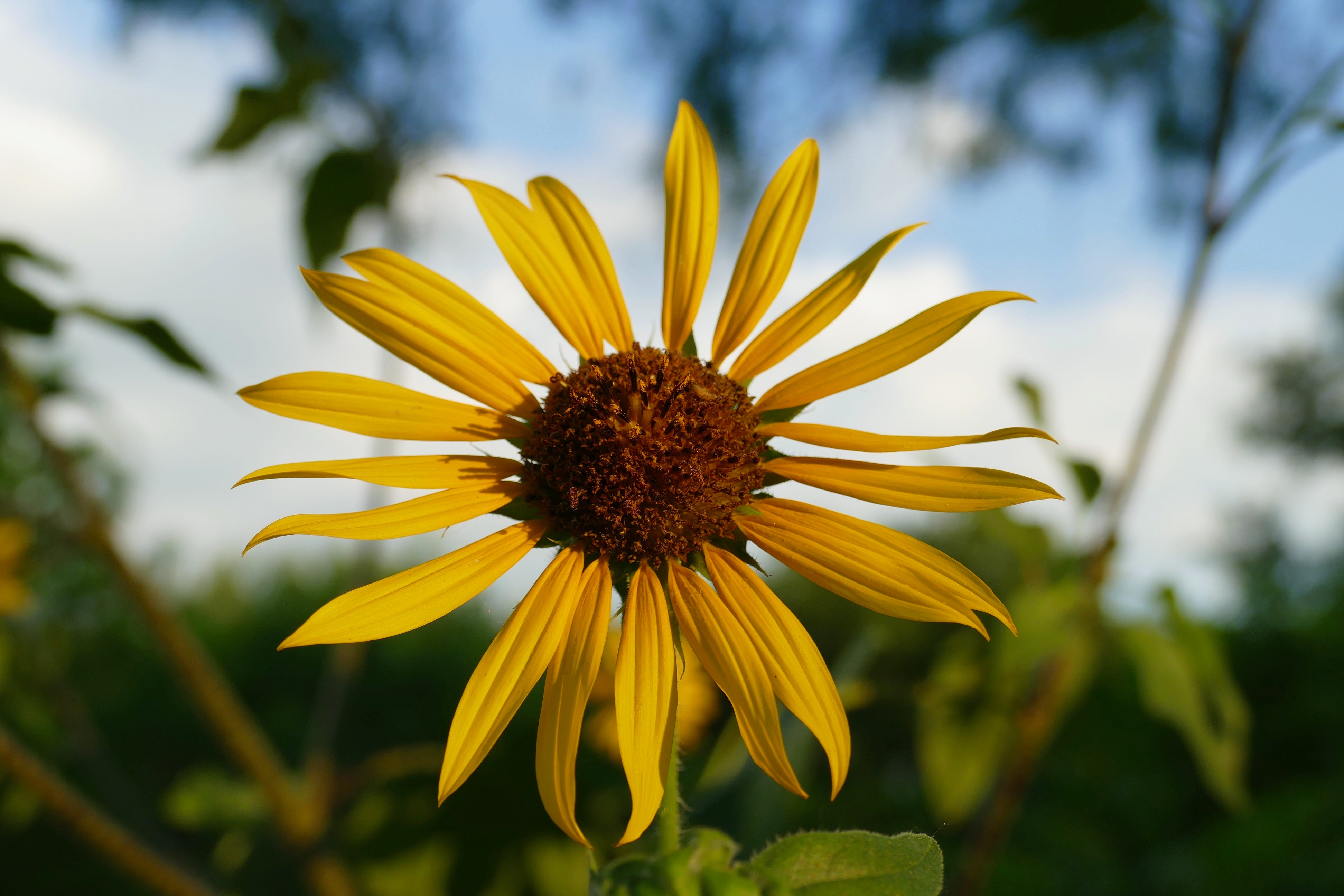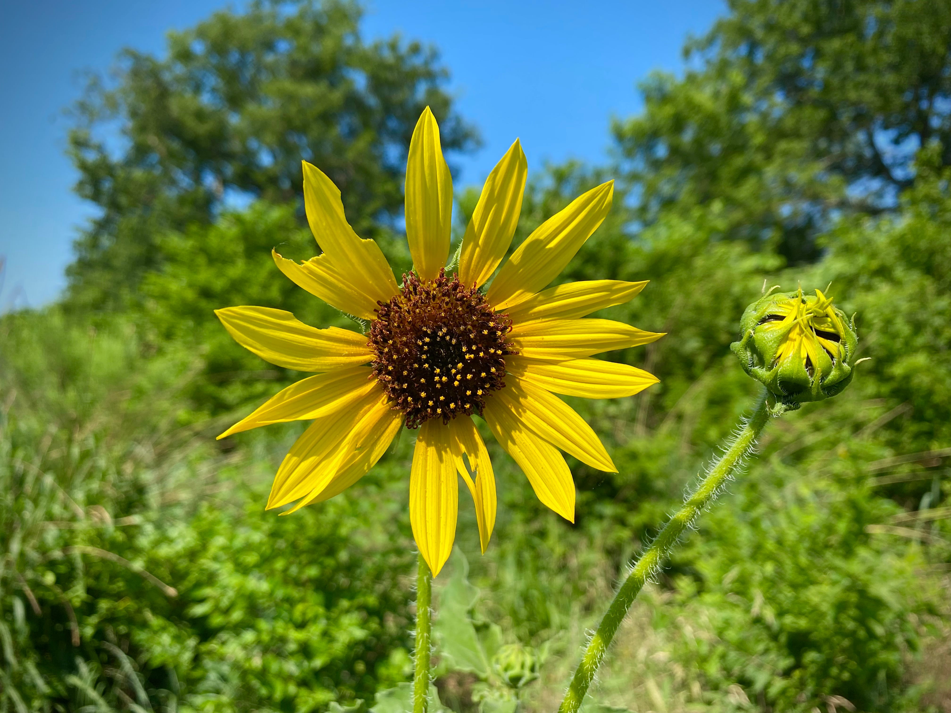 The first sunflowers of the summer bloomed this week here on the bluff, as the rains stopped, the clouds disappeared, and the temperatures pushed above 90 and didn’t turn back. I thought it would just be the colonizers, but on Thursday one of the native Maximilian sunflower plants popped at the edge of the roof, portent of a long yellow summer.