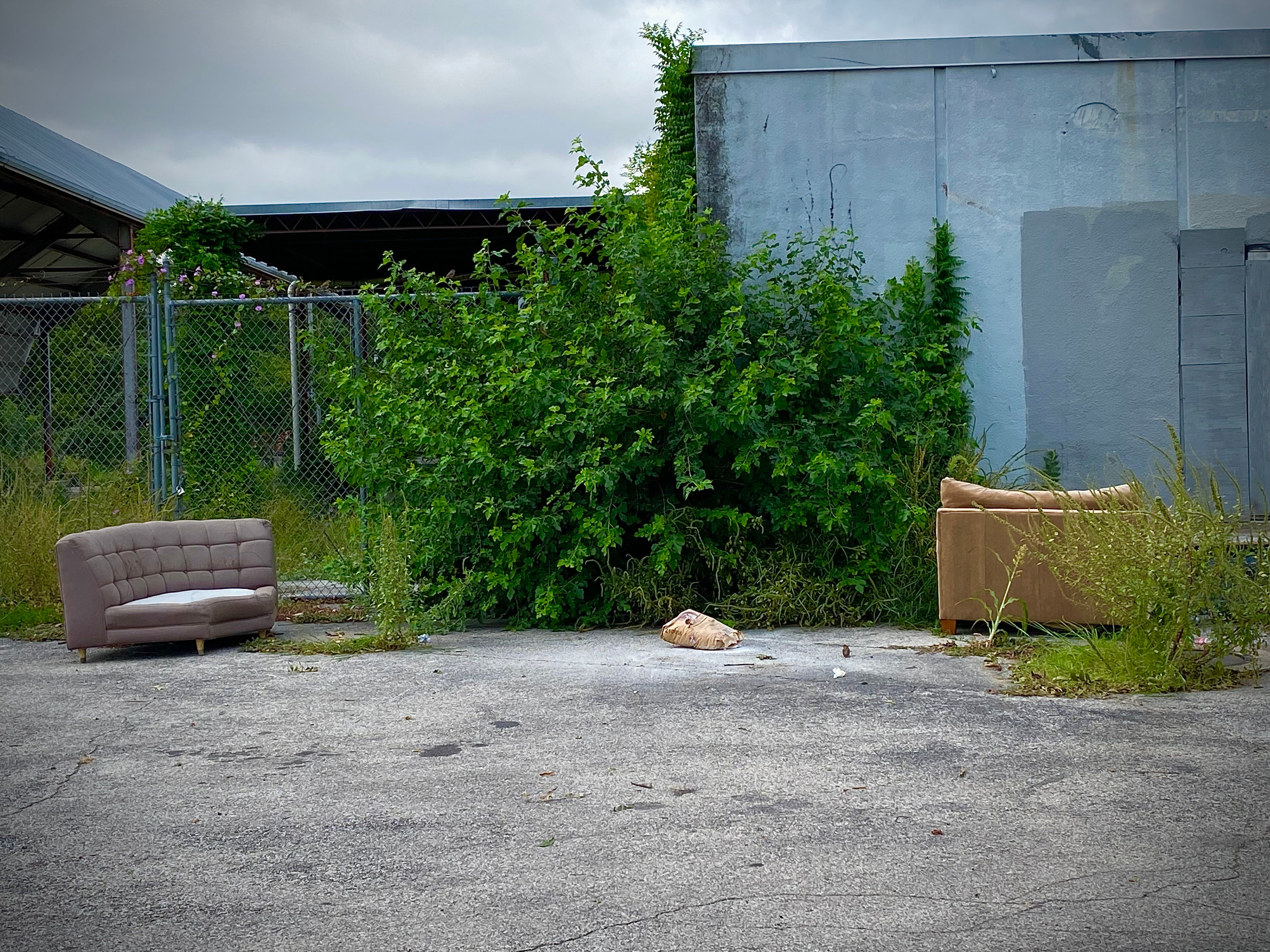 For now, the neighborhood above the river maintains a curious balance between industry and entropy. Tuesday morning I came upon a huge flock of sparrows hanging out on the sectional sofas someone recently dumped by the loading dock of the abandoned lighting factory. They were dining on a huge bag of restaurant flour that somehow found its way there to that asphalt by the bus stop. The bag had burst open and spilled some of its contents onto the pavement, and the white powder was decorated with the tripod tracks of tiny dinosaurs.