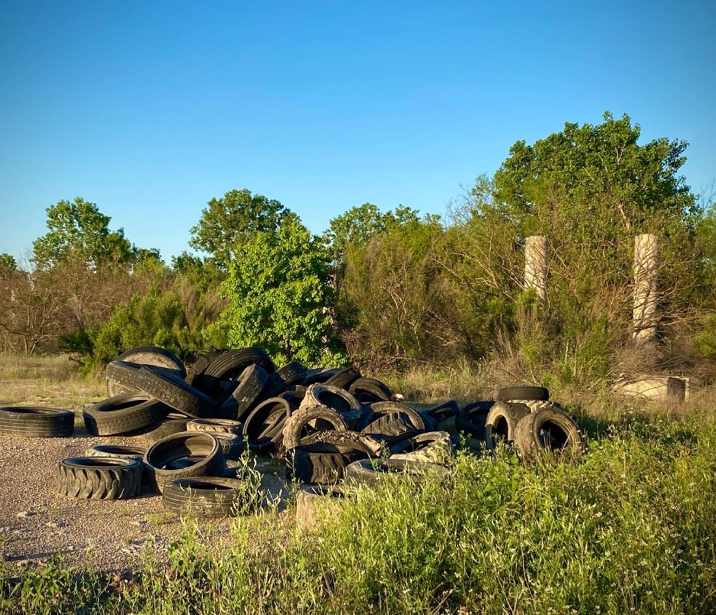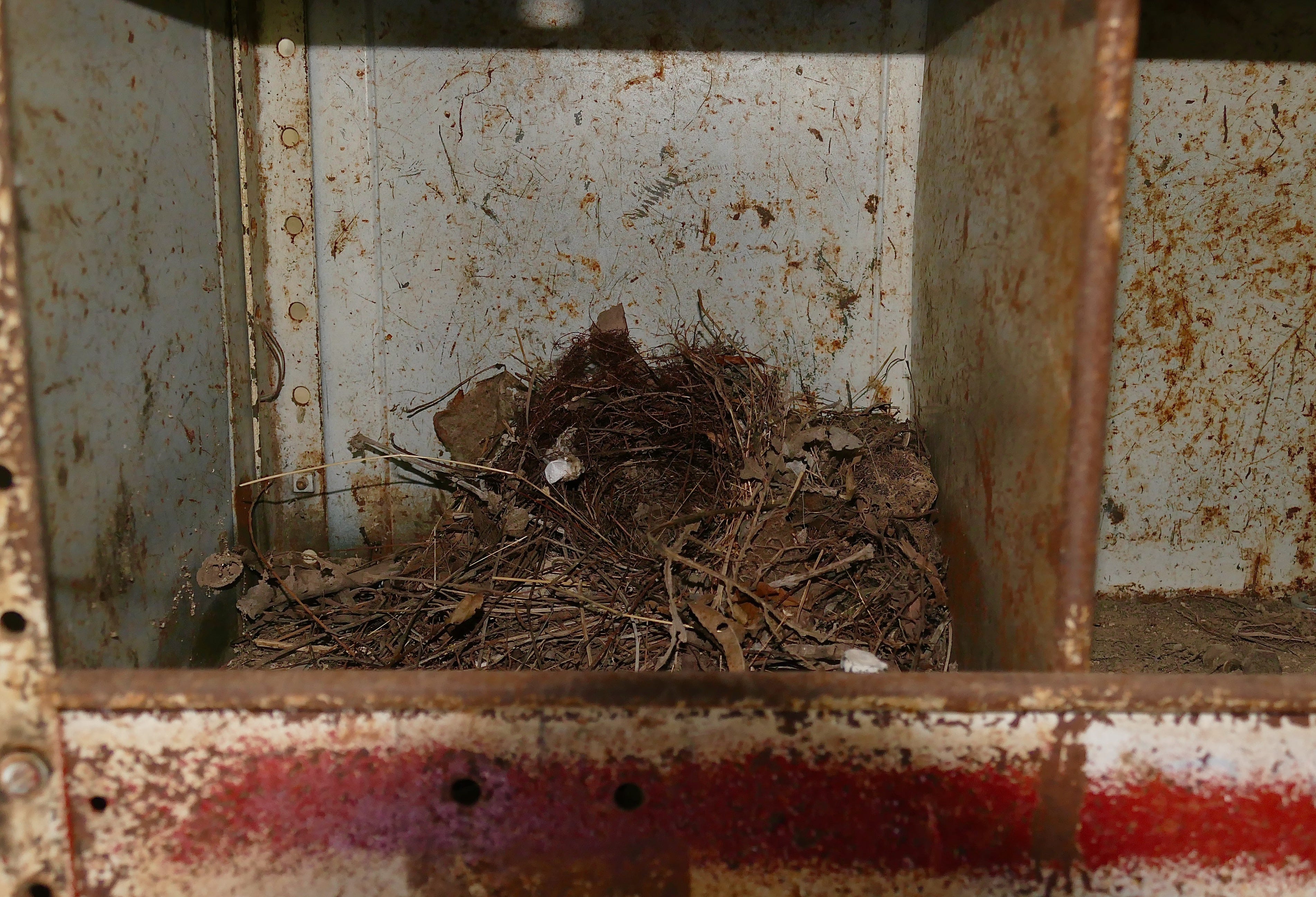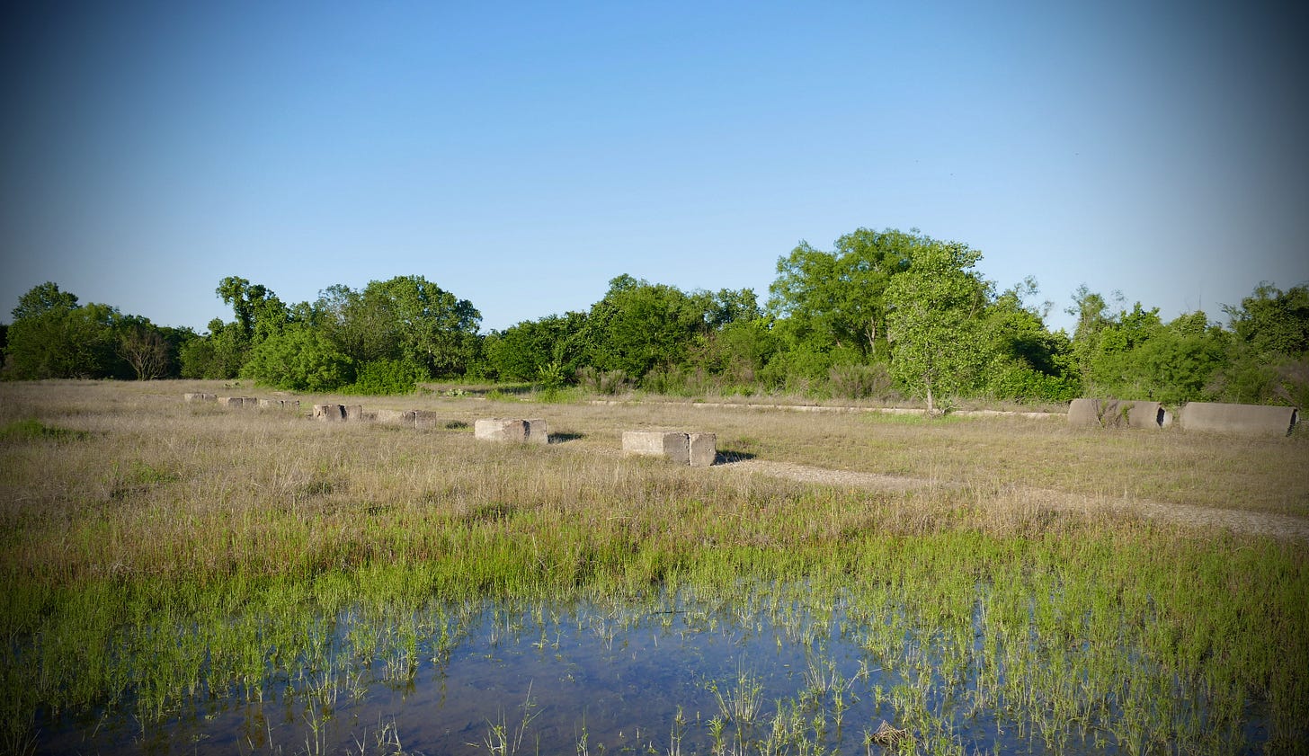 If you visited the place without any of that backstory, you could almost believe you had stumbled across some accidental Chinati, with the big concrete blocks arrayed in mysterious geometries across the marshy plain. The walls that once demarcated the different zones of the operation are crumbling, overgrown with cactus and poison ivy. The amazing ramp to nowhere that was there two years ago is gone, a pile of wild tires dumped at what used to be its landing pad. The one building still standing is a cinder block shack that previously housed an electrical switching station, but urban foragers have harvested all the copper since I first found this place, leaving only the lockers of the workers and a few broken chairs. A songbird made a nest in one of the lockers, but that too has since been abandoned.