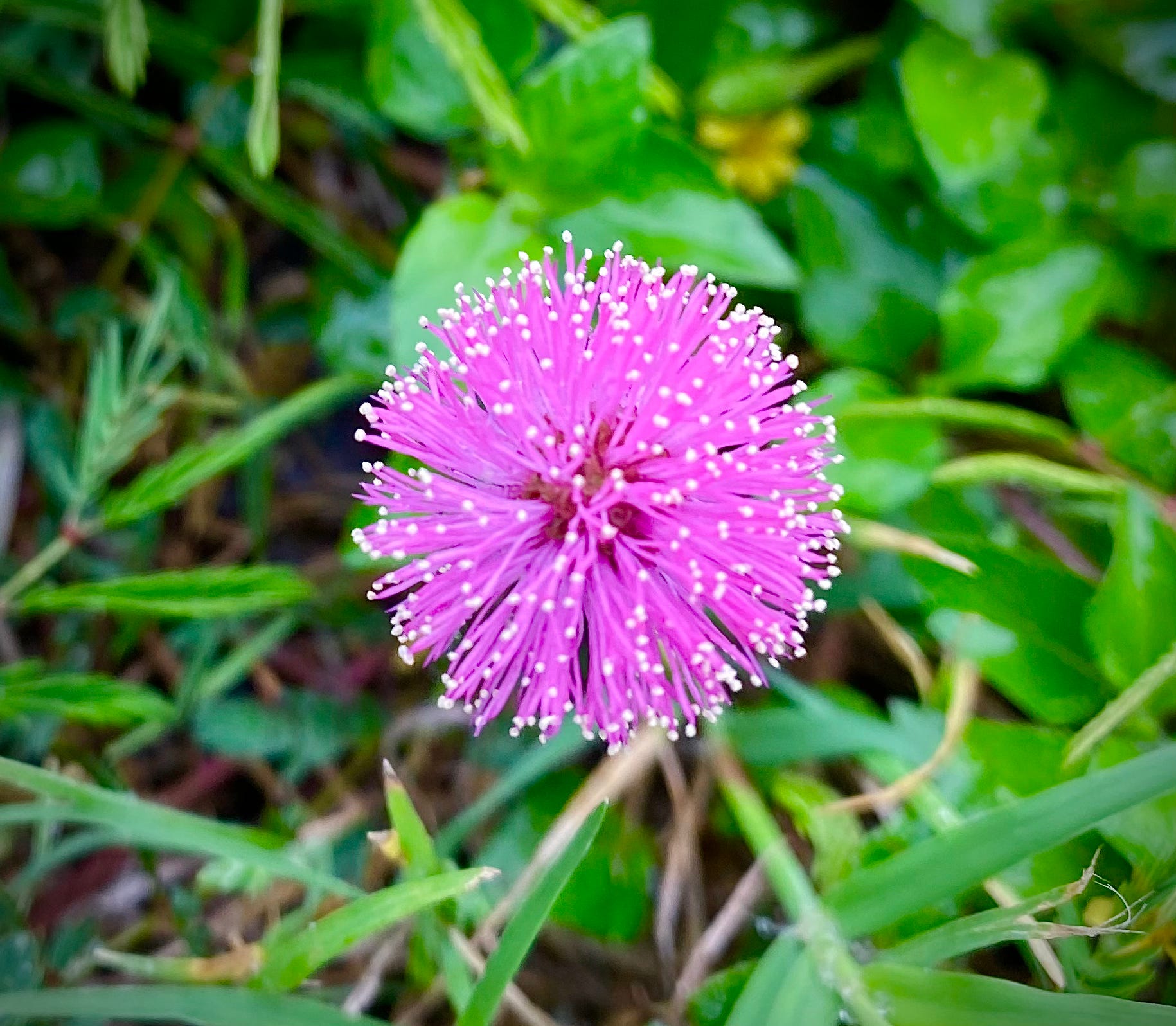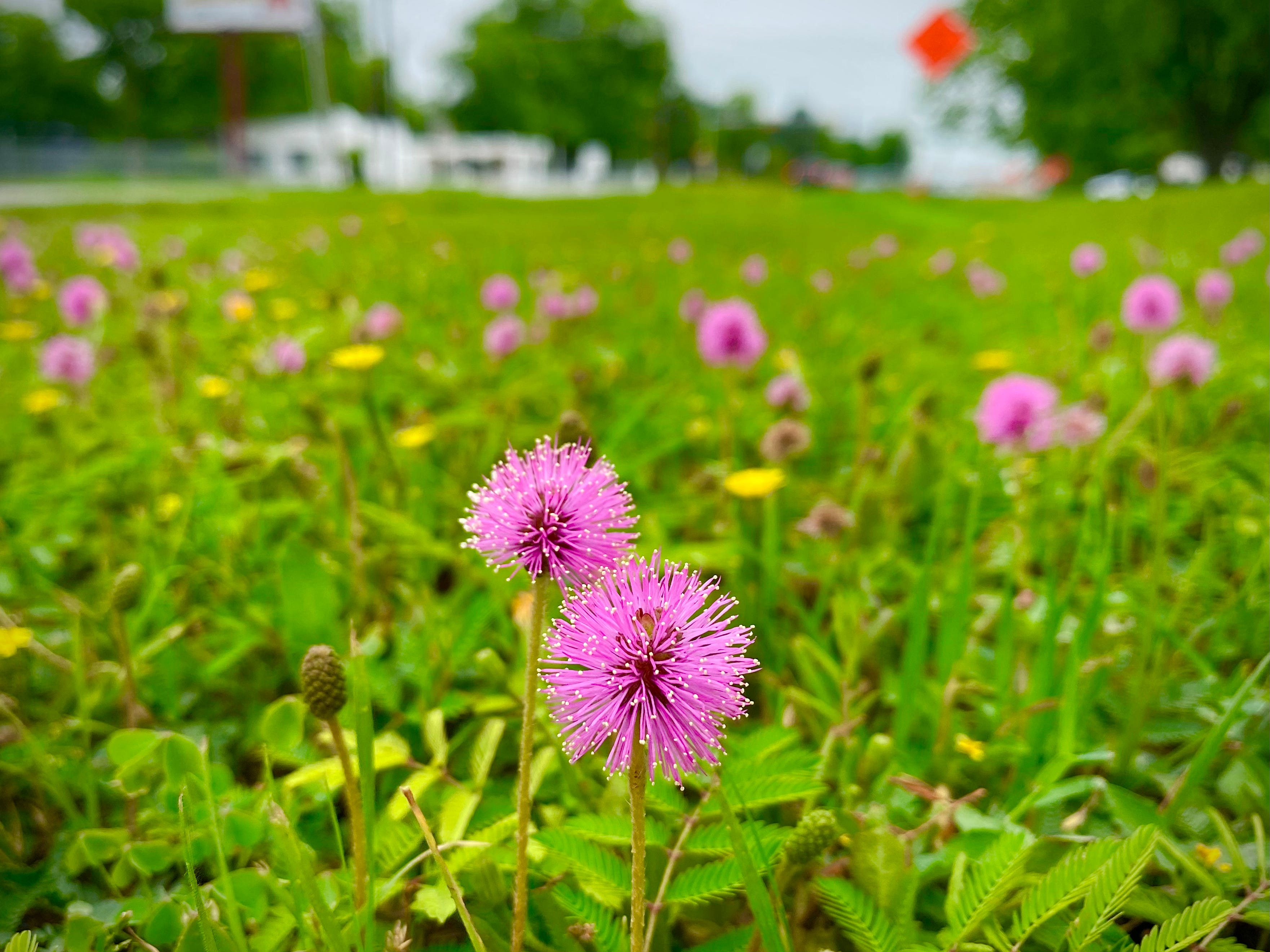 The thing I had walked our two-year-old out into the truck-trafficked danger zone to see was not the swallows we got as extra credit, but an astonishing flower I had come upon earlier that day. There at the edge of the driveway of the new motor oil distribution facility was a patch of hot pink legumes that looked like some exotic sugary treat you would eat on a stick. Mimosa strigillosa, I learned when I found it in the book, after thinking it was some lovely weed. Popularly known as powderpuff, a hardy native that does well in sandy soils, growing in sprawling mats across the ground. “Stamens numerous, conspicuously exserted,” said the guide, leaving me to wonder whether “exserted” is a botanical term or a typo.