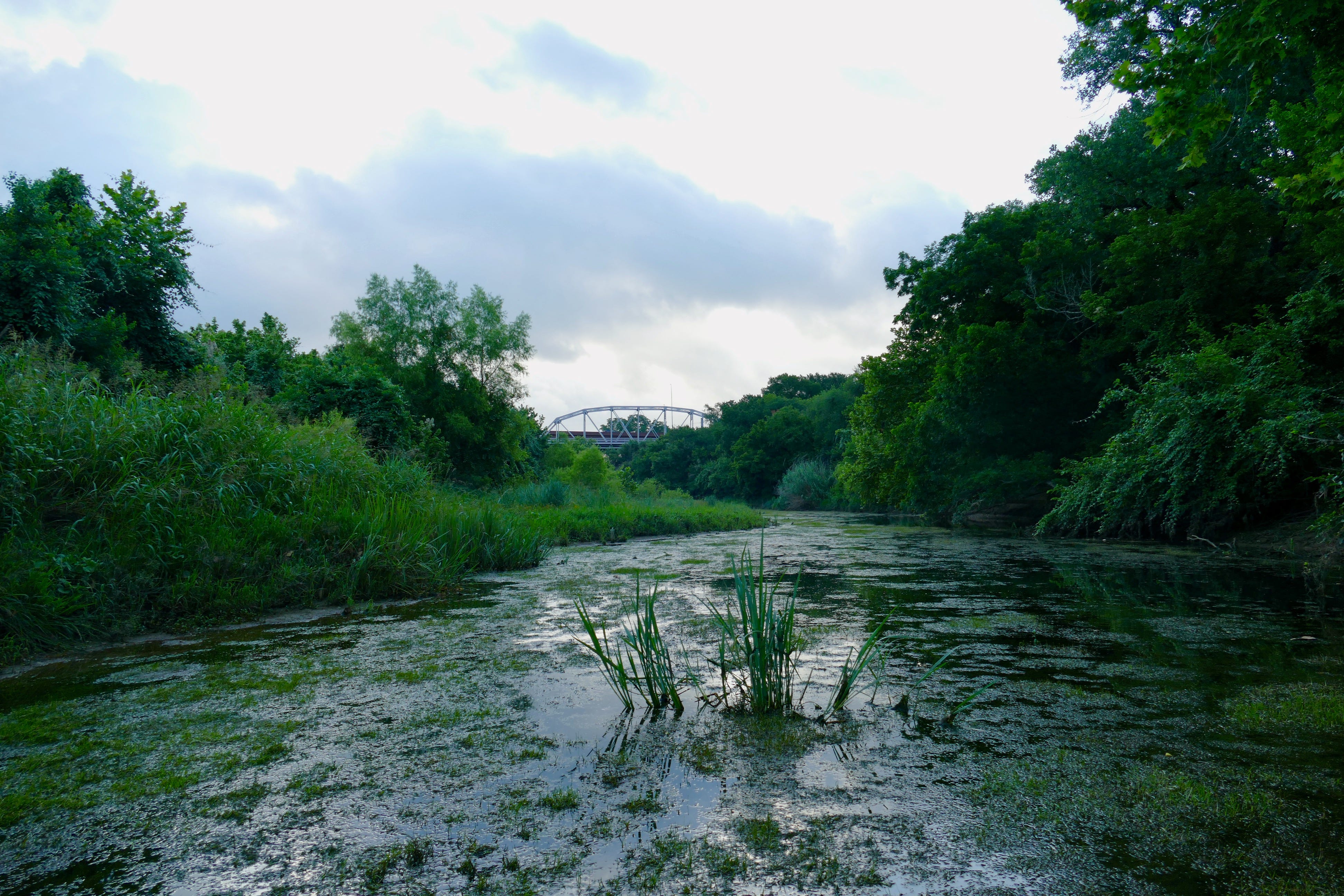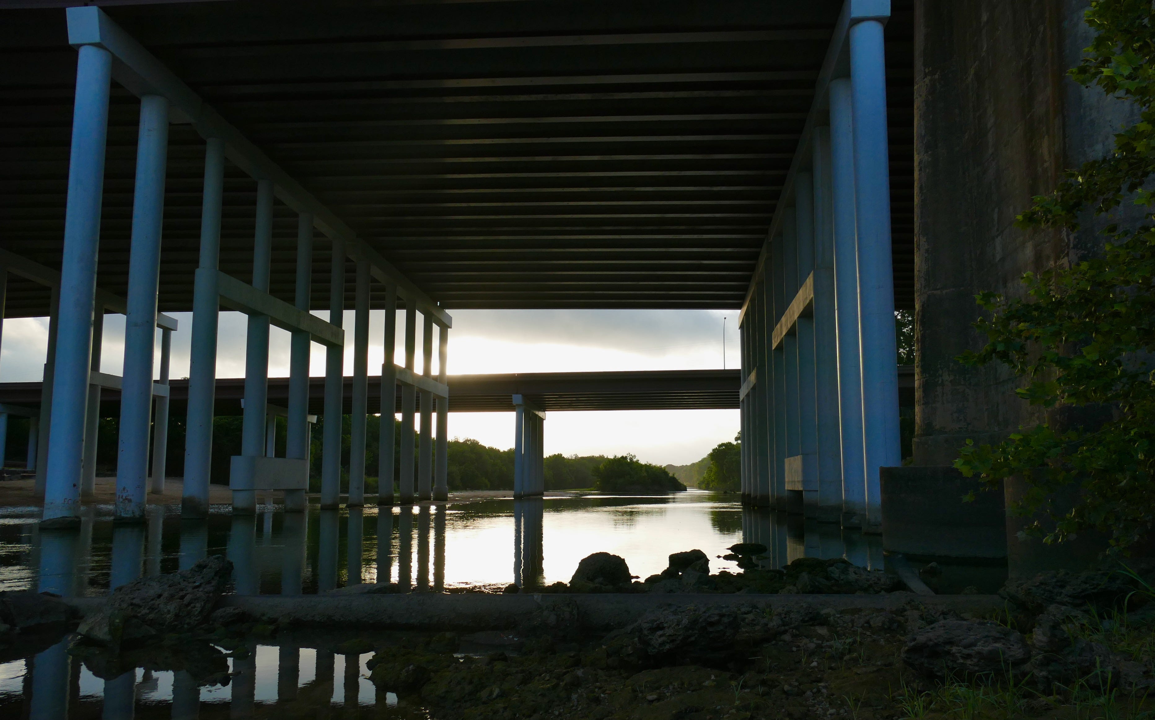 When we got to the bridge, the river was extra deep, still channeled into a narrow cut by the highway crews, who are now turning the involuntary park in the Department of Transportation right of way into an official park, complete with interpretive plaques and little workout stations. Ten years ago you would sometimes see dudes changing their oil right there at the water’s edge, and the first time we put our canoe in there twenty years ago, my then-first grader son almost flunked the survival test by picking up a used needle. There’s still an old pipeline exposed in the channel, and Lupe and I used that as our tightrope to cross the deep.