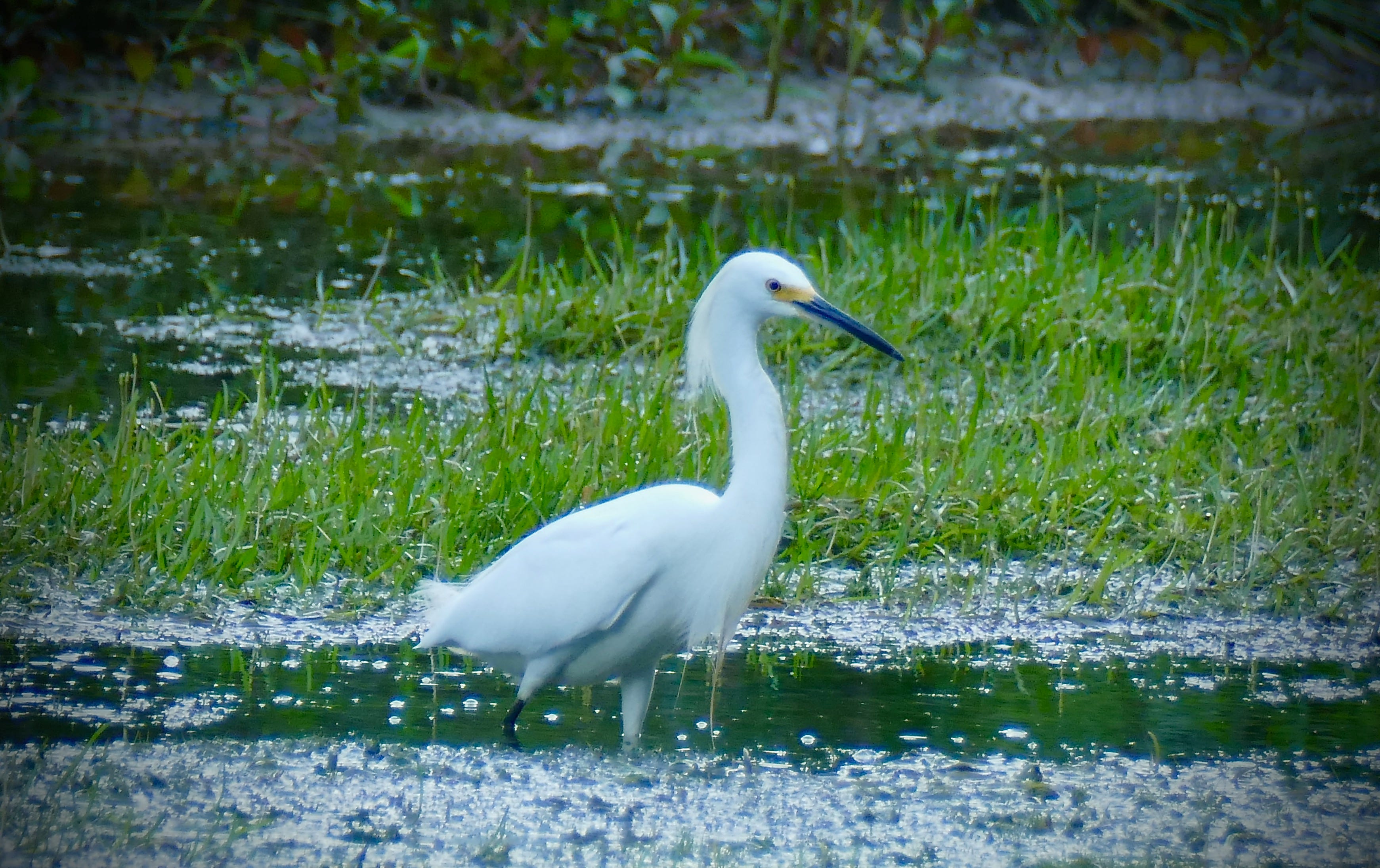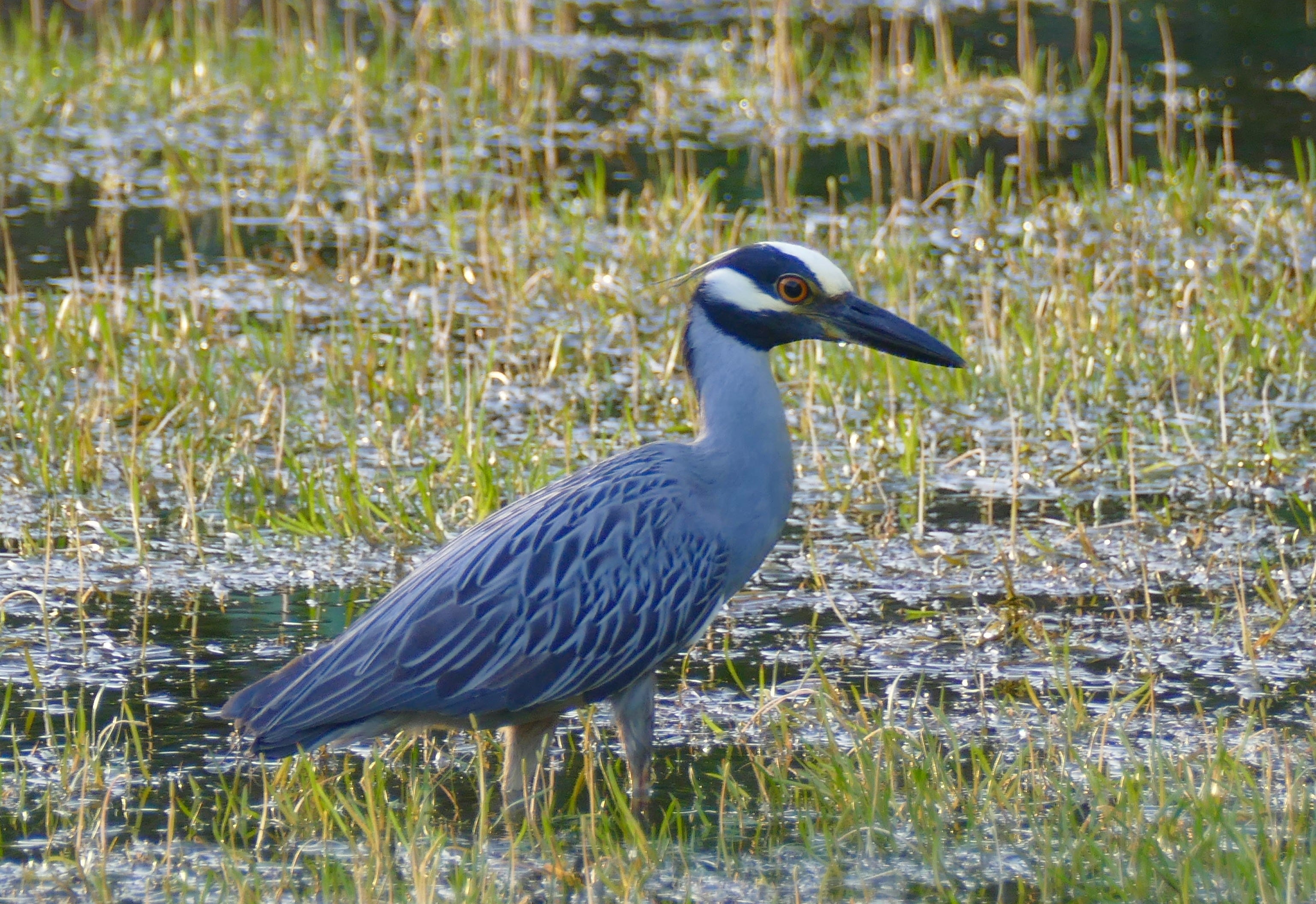 We saw at least three of these yellow-crowned night herons on Saturday’s wander, a bird it’s rare to see ever, especially that far into the beginnings of the day. All the herons have intense eyes, but I had never seen just how big the night herons’ are, no doubt to better be able to hunt in the water by night. There were more green herons there, too, and a few snowy egrets, including one whose feathers seemed to be dripping off.