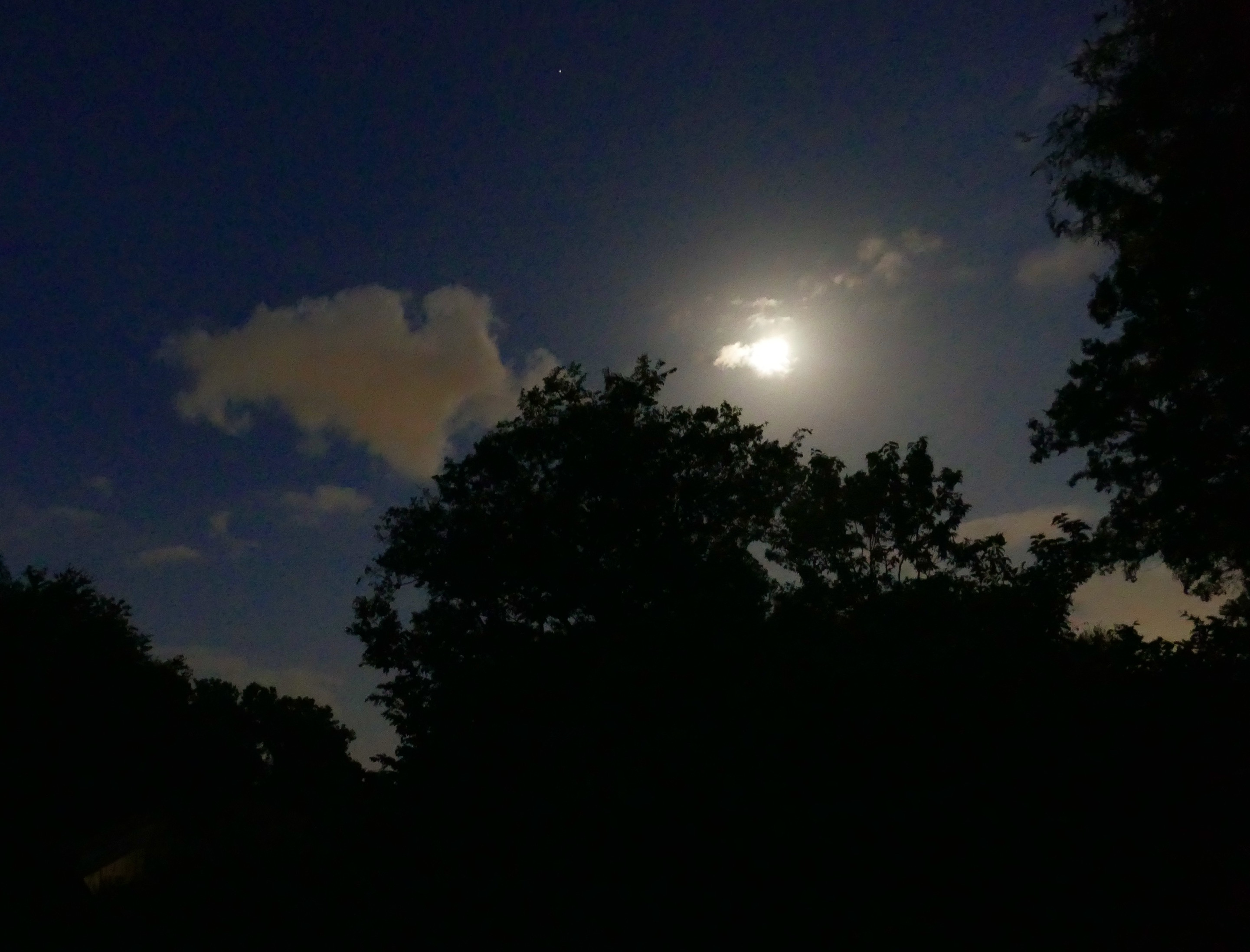 Saturday morning the East Austin Street Retriever and I headed out into the woods behind the factories right at daybreak, a little after 6 a.m. She’s been pretty down since her companion died, missing meals and moping around. The first couple of days after the event, we walked on the street where we had walked with him the morning of the accident, and she would stop at every spot he had marked. And the days since then have been crazy busy for me, putting in long hours inside the screen. But Thursday’s full moon beckoned, and while it was already waning Saturday morning, it was intensely bright, dropping down in the southern sky below Jupiter and Saturn. When I called Lupe to head to the back gate, she looked instantly revived, and the truth is we both needed it.