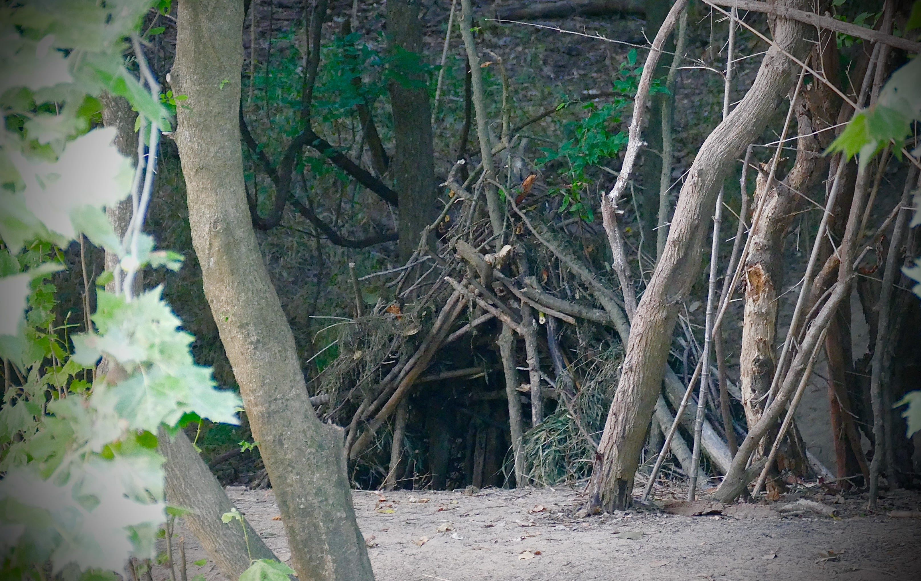 We walked on, and came upon a different kind of development—a pair of recently constructed wigwams down on the muddy shelf above the channel, under the canopy of the big cottonwoods that are currently raining their snowy seeds all over the woods. I wondered if the dude we had passed came from there. And if he had any friends.
