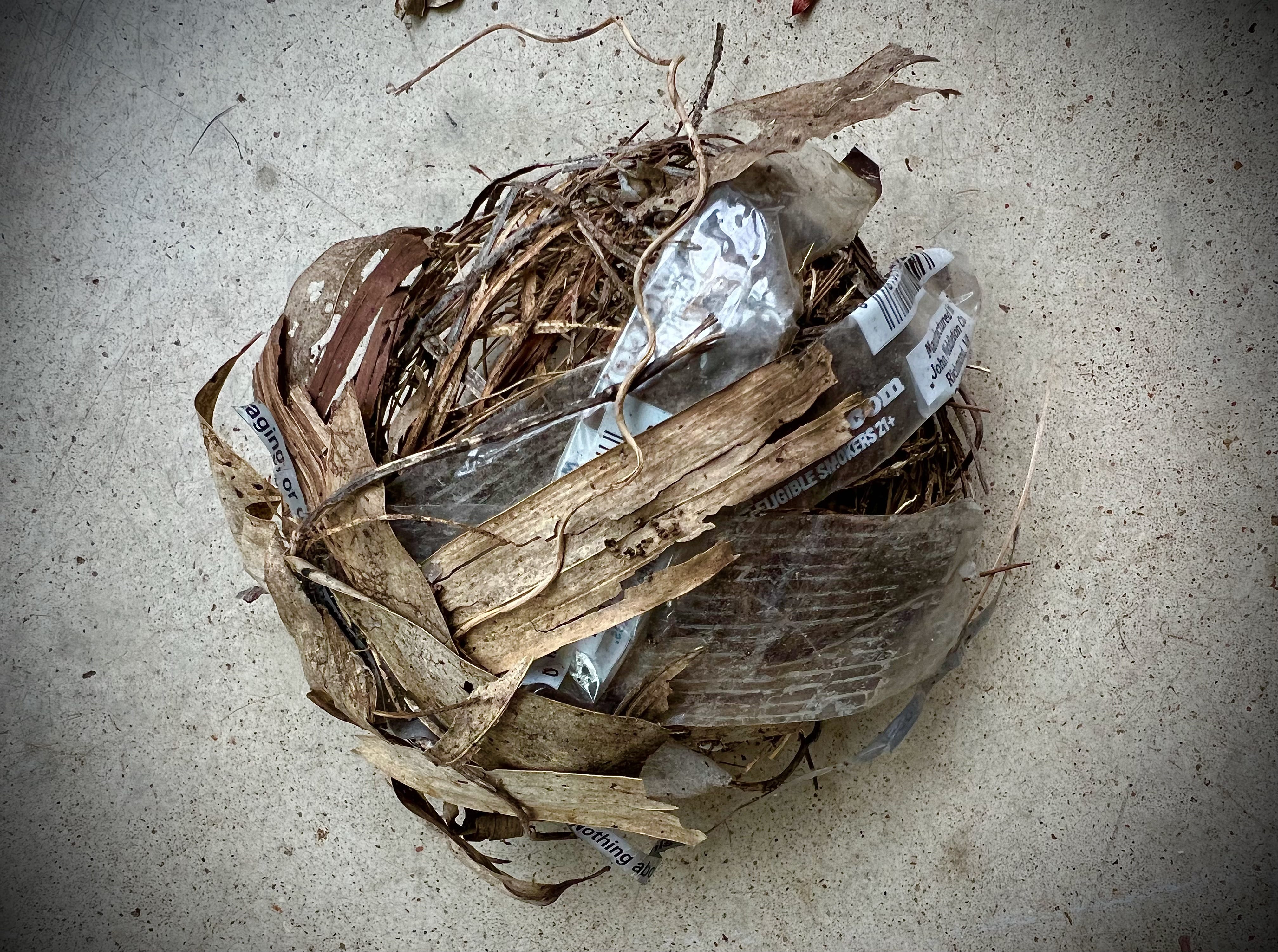 I started noticing these nests around the yard in autumn, after they had been left behind. It was only when they started making them within sight of our living room and bedroom that I understood it was the cardinals who were harvesting fragments of open-cell foam from the loading dock next door and the plastic wrappers the workers sometimes toss to the curb after eating lunch in their cars, and turning them into avian building materials.