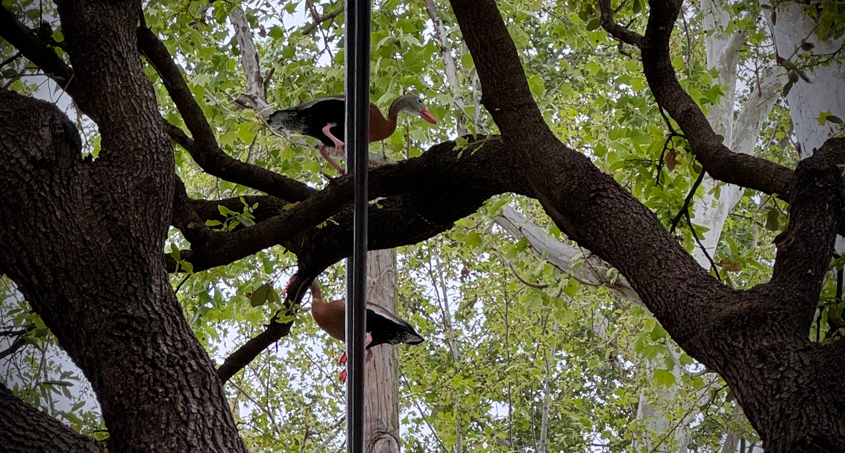 The ornithological authorities call Dendrocygna autumnalis a “boisterous duck.” They are big, with long thick legs, and when they move around in those urban trees their kinetic energy has a paradoxically gawky grace. Their preferred nesting sites are tree hollows, and when you see how big the seasonal flocks are, and how big the individual ducks are, you might wonder just where it is they are finding places to live and breed in the city.