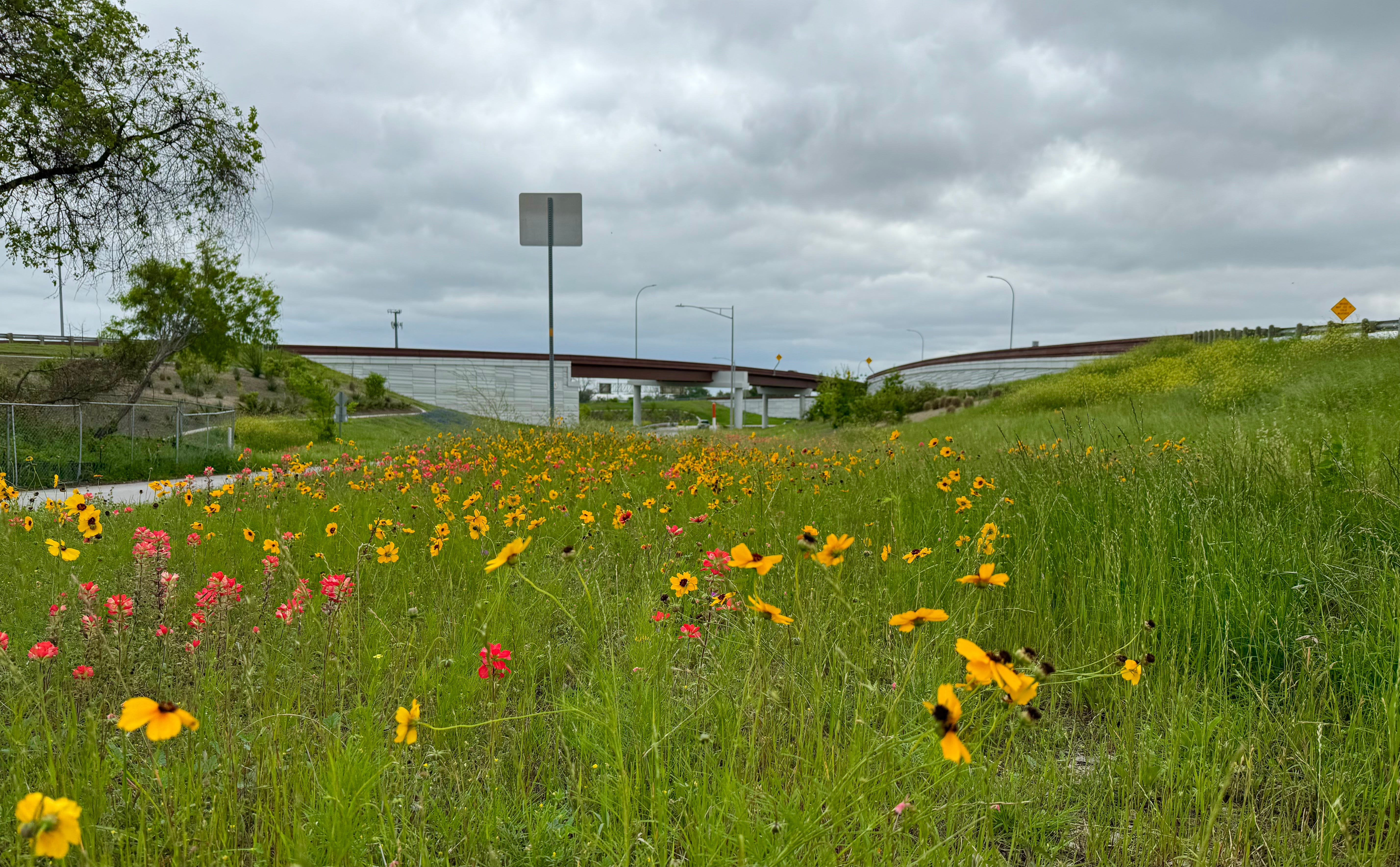 The first quarter-mile out of our front gate is always a little hazardous for a jogger, as we live half a block from a spot where traffic from two major highways connects with the main roads coming east from downtown. A convergence of concrete loops, hurtling trucks, and people anxious to get to work. Not a landscape where you would think wild nature is steps away. Until you learn that, on a planetary surface that now has more human-made material than natural biomass, it’s often in the most casually brutalist pockets of the world we engineered that other life makes its home. As I was reminded Monday morning, running in the rain, when I came upon the first burst of native wildflowers blooming in the berm. Indian paintbrush, coreopsis, beeblossom and bluebonnets, holding out in a spot that was terraformed by big machines five short years ago when they remade the highway into a high-speed toll road.