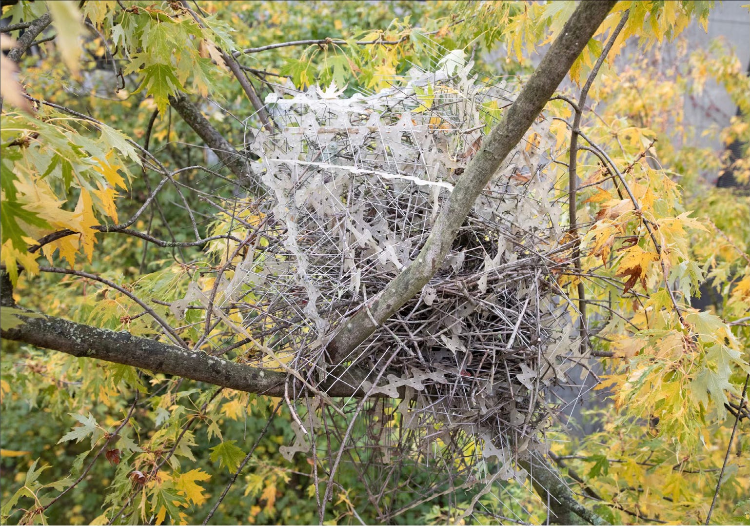 On July 24, 2021, a patient on the fourth floor of University Hospital Antwerp in the Netherlands looked out the window of their room and noticed a very strange nest in the tree that centered the hospital courtyard. It could have been mistaken for a piece of trash, as it was made of plastic and metal. It was occupied by magpies, who traditionally build their nests deep inside thorny bushes. These 21st century magpies had figured out how to rip the sharp metal anti-bird spike arrays from the roof by peeling their plastic bases up off the edifices to which they were adhered, and appropriated them to create an Anthropocene nest straight out of H.R. Giger’s Wild Kingdom.
