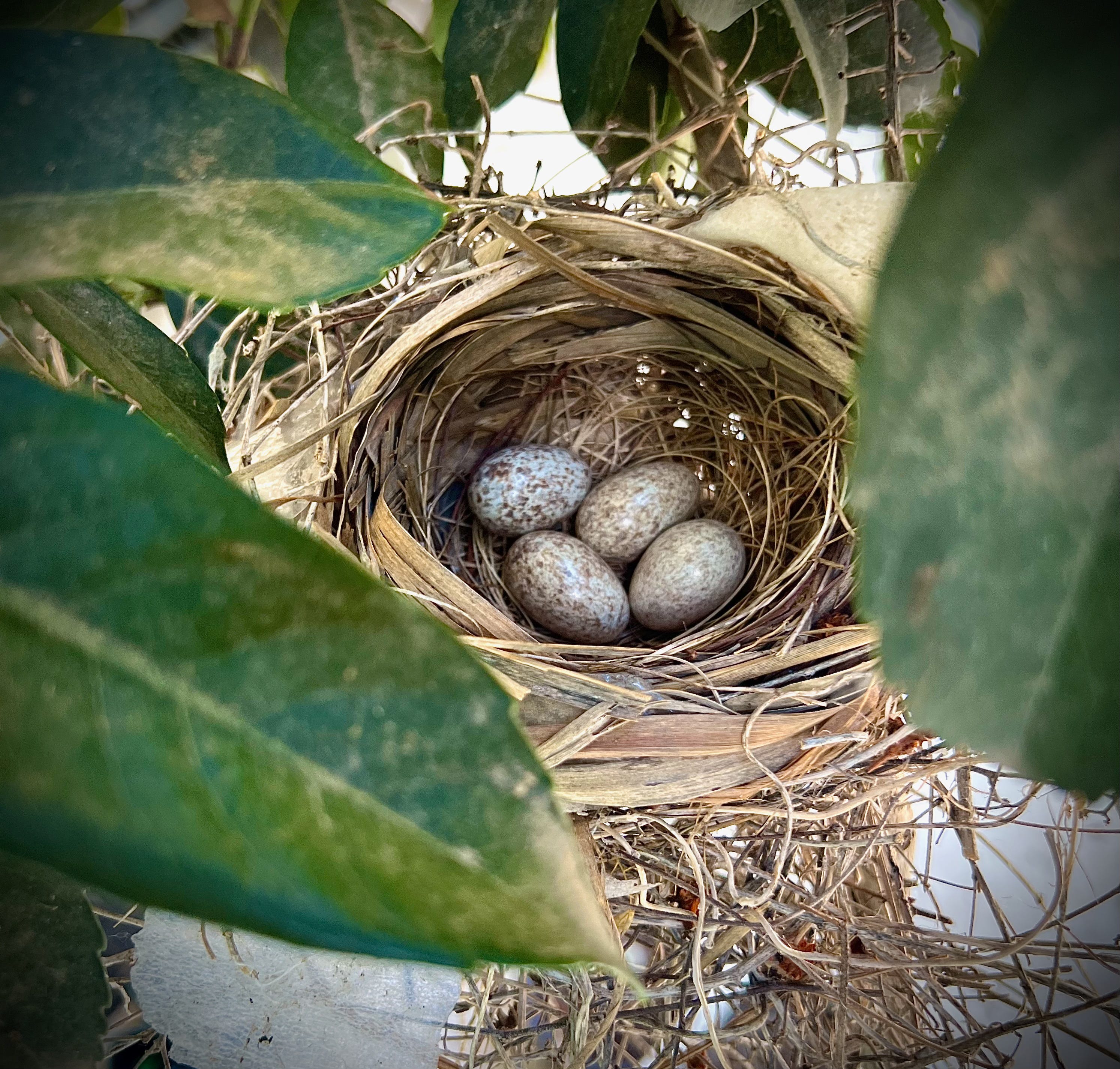 The exposed cross vine took a hit in the hard winters of the last few years, and we thought that special nesting spot was lost with it. But it’s started to grow back, and this month we saw a new nest there, at the apex of our roof. Look up, if you know where, and you will likely see the silhouette of the mama cardinal, sitting on her beautiful blue and brown eggs.