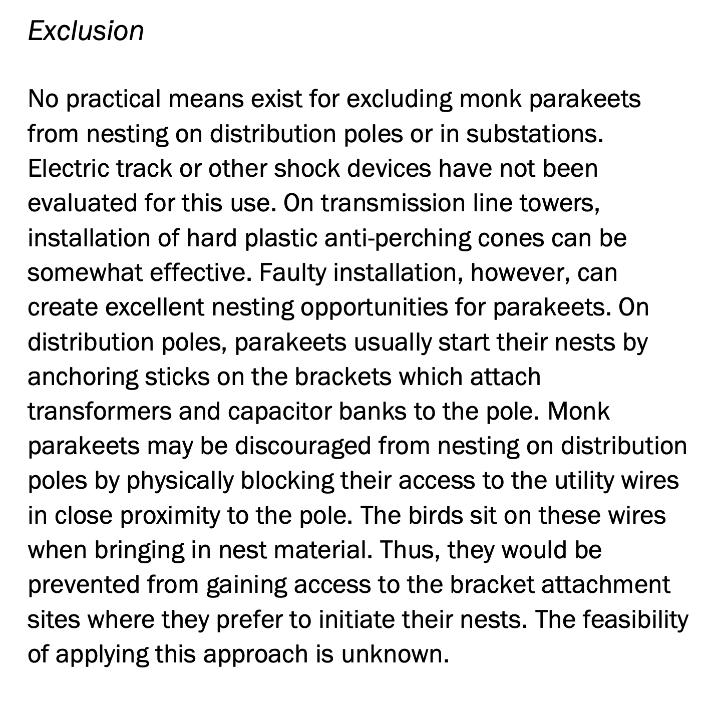 There is an entire literature out there on how to manage the parakeets’ colonization of our power and telecommunications infrastructure, and it’s kind of hilarious in its clinical documentation of Sisyphean futility. The parakeets are basically unstoppable, in part because they are so perfectly adapted to our own colonization of the landscape. The USDA’s white paper on the subject, part of its Wildlife Damage Management Technical Series, is an accidental masterpiece of invisible literature: