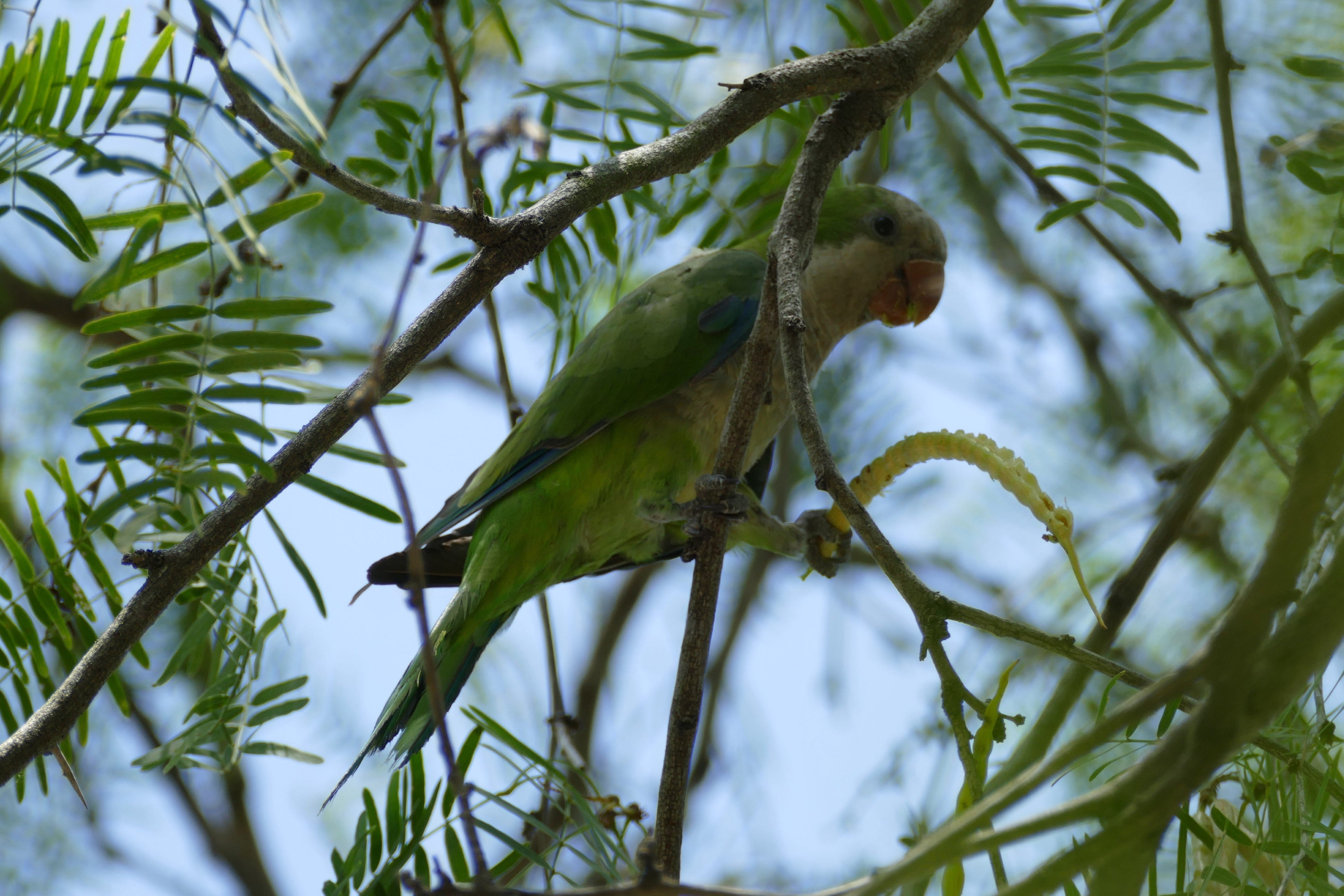 The monk parakeets are an invasive species, but they are a peculiarly charismatic one, and I love this season when the old mesquite brings them for a monthlong picnic above my head. Sometimes I find an empty peanut shell in the yard or on the street that has been left by one of them, and I wonder if they live at some circus where those come from. They announce themselves loudly whenever they are headed your way. They can get away with it, having found a place where none of their hometown predators exist.