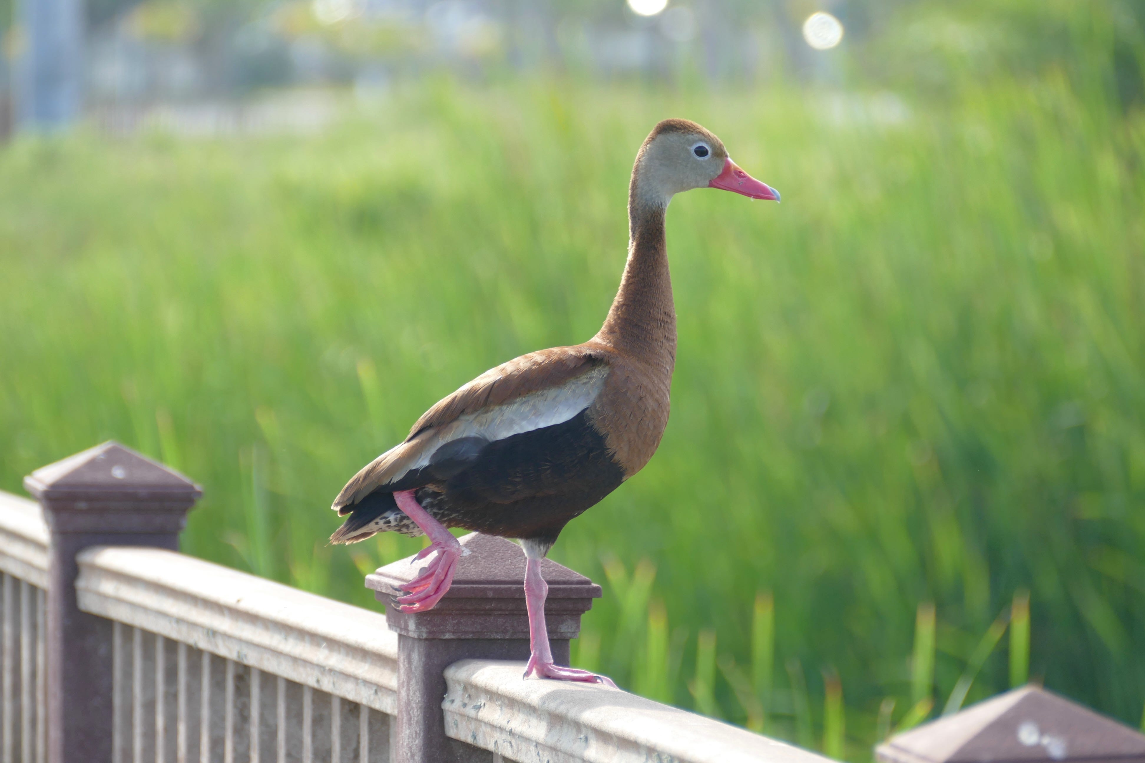 Toward the end of the boardwalk, there was a little plaque recognizing the work of a local Eagle Scout who built boxes designed to house breeding pairs of black-bellied whistling ducks, the same species whose ducklings we had seen when we set out on our holiday. And there the ducks were, successfully drawn by the simple gesture of making a tiny slice of our habitat into theirs. Even closer, I heard a cheep and saw a juvenile moorhen emerge from the reeds, its head a strange combination of reds, yellows and blacks, begging food from its red-beaked parent, there in the shadow of the water treatment plant and the electrical substation, and the launchpad to Mars.