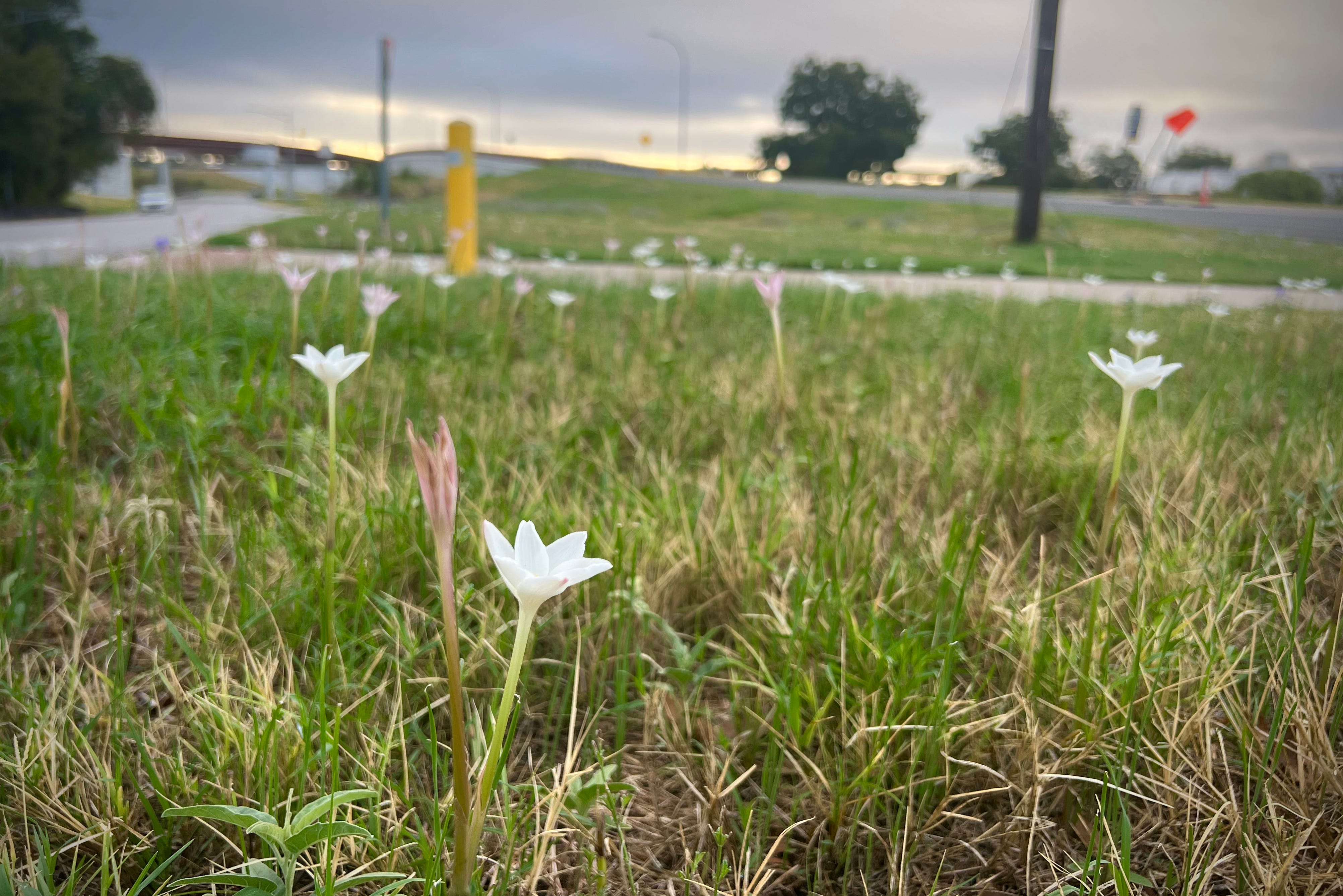 I had almost forgotten about the existence of rain lilies until a week later, when they appeared here and there across the browned land, little eruptions of fresh native life in the dried-out expanses of ornamental grasses that cover the unpaved parts of this city that once was prairie. I first saw them at the base of the onramp near our house. That afternoon, driving back from lunch with a friend, I saw them all over, mostly in the slivers of dirt left between the sidewalks and the curbs of major roads.
