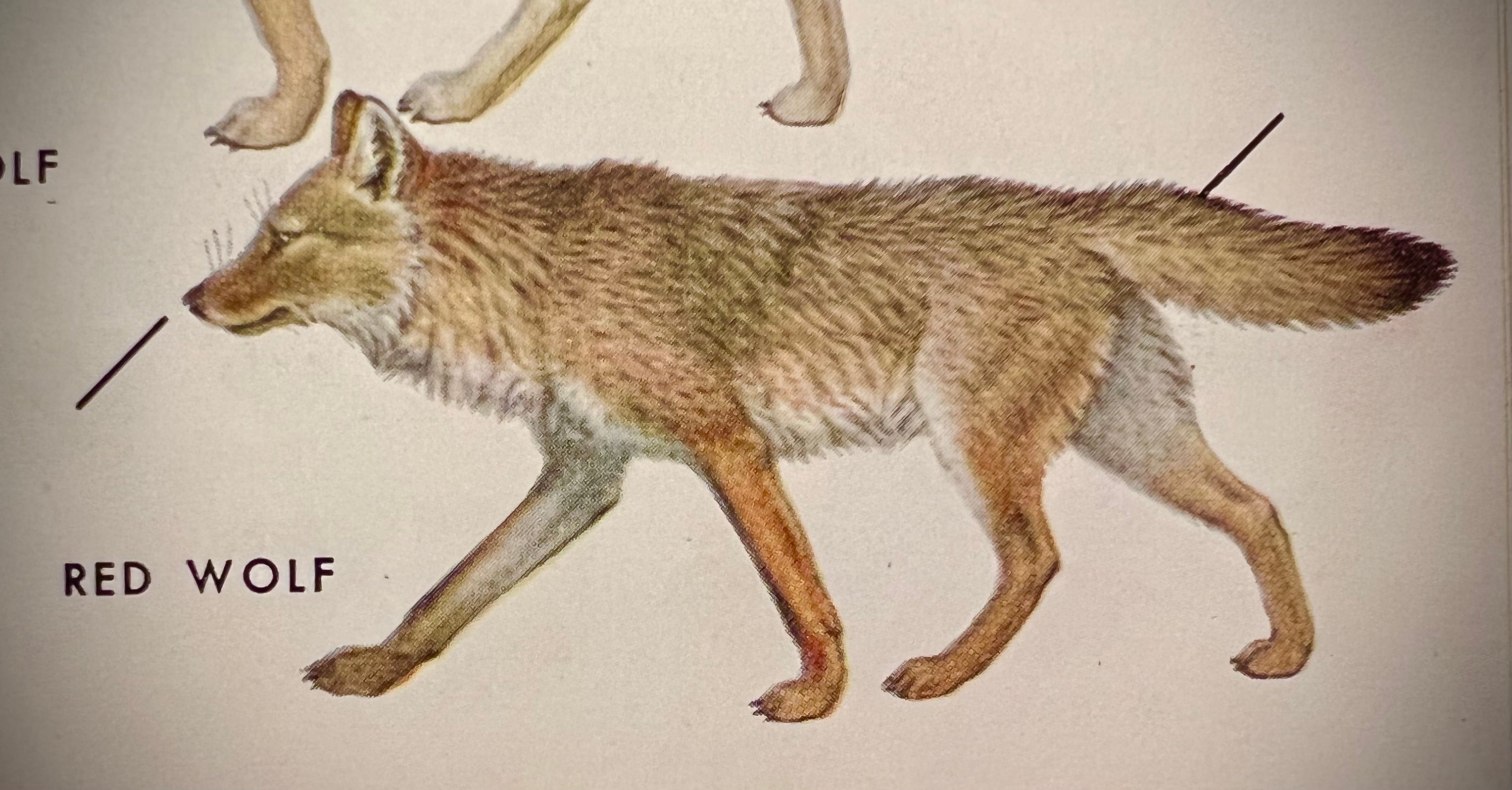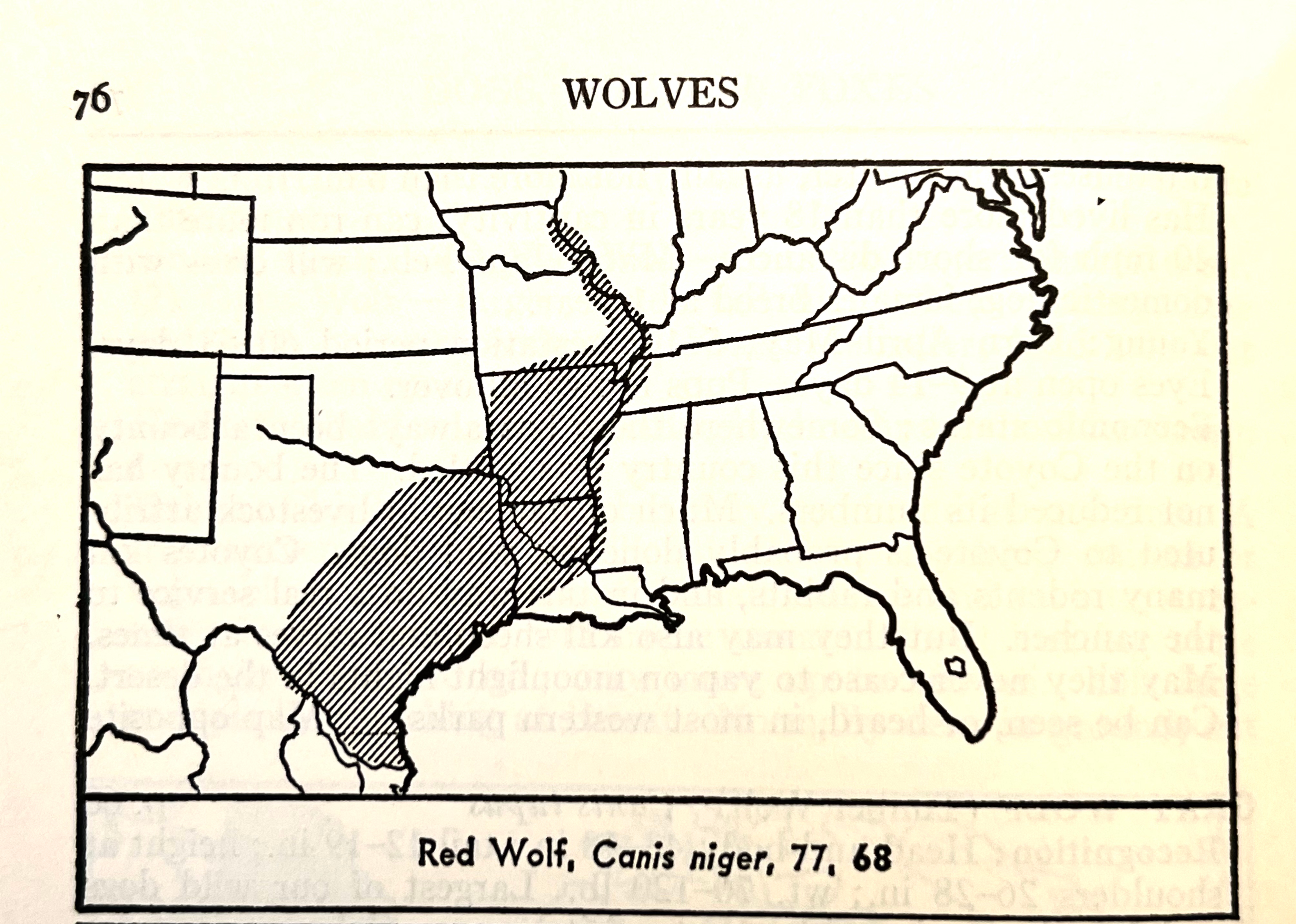 Sunday afternoon as we were hanging out at home I opened the book to the astonishing map pictured above, showing the range of the Red Wolf that once roamed widely across Texas, a creature now critically endangered. I hadn’t realized the species used to thrive as far north as St. Louis, and I wondered how old the book was that this could have been accurate. When I looked at the copyright page, I saw this edition had been published the year I was born, and the original edition the year my dad graduated from high school.