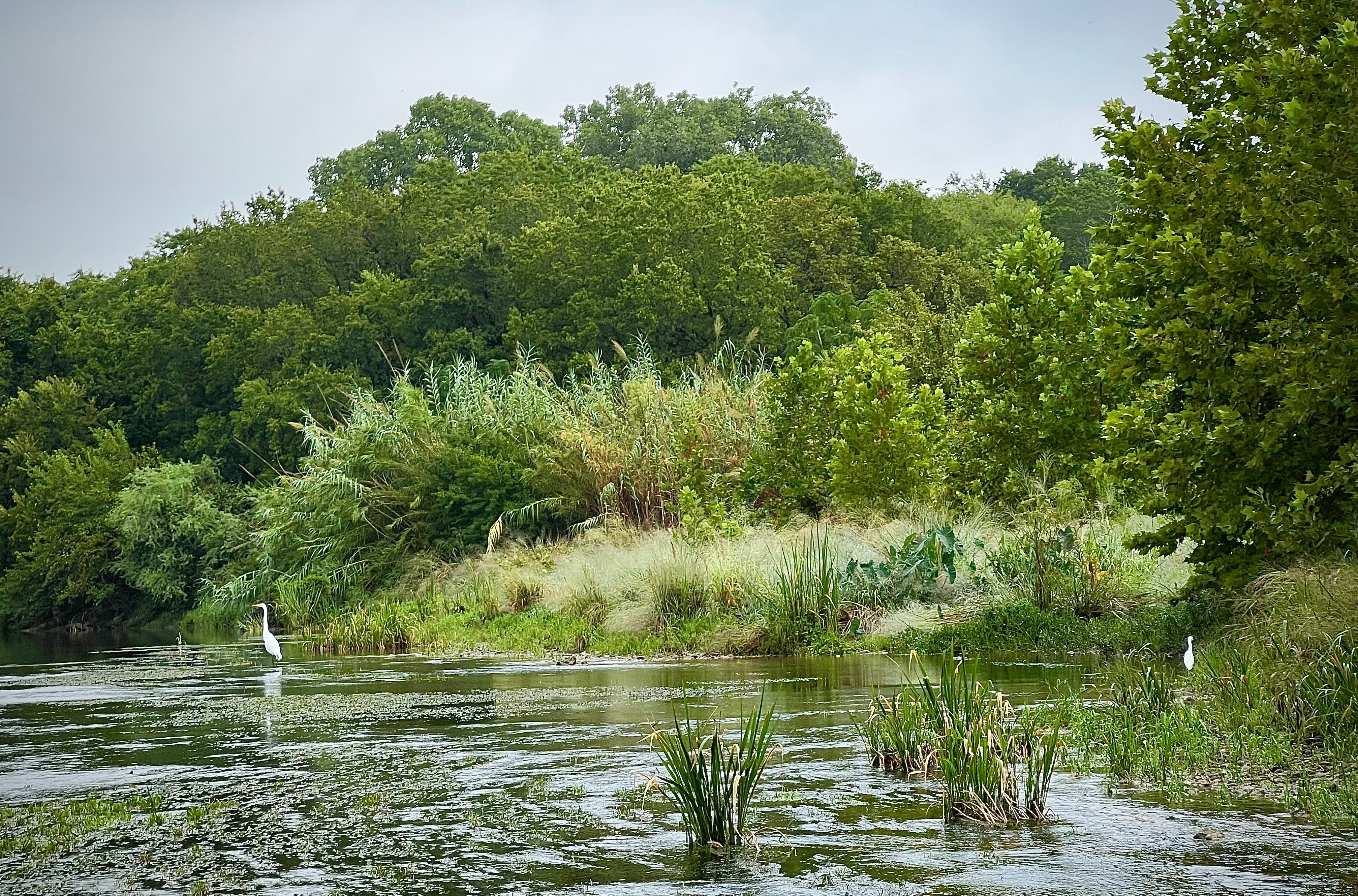 All summer long, despite the drought, the Lower Colorado River Authority has been releasing water from the dams upriver, supposedly to supply agricultural irrigation downriver. The releases have been in the early morning, meaning the urban river is flooded as soon as the sun comes up. This week the releases finally stopped, and we could walk in the shallows of a river that feels more like its natural self. The favorability of the conditions was confirmed by egrets and herons, green, white and blue, the half-dozen turtles who poked up their heads to look as we emerged from the woods, and by the fish sign in the current.