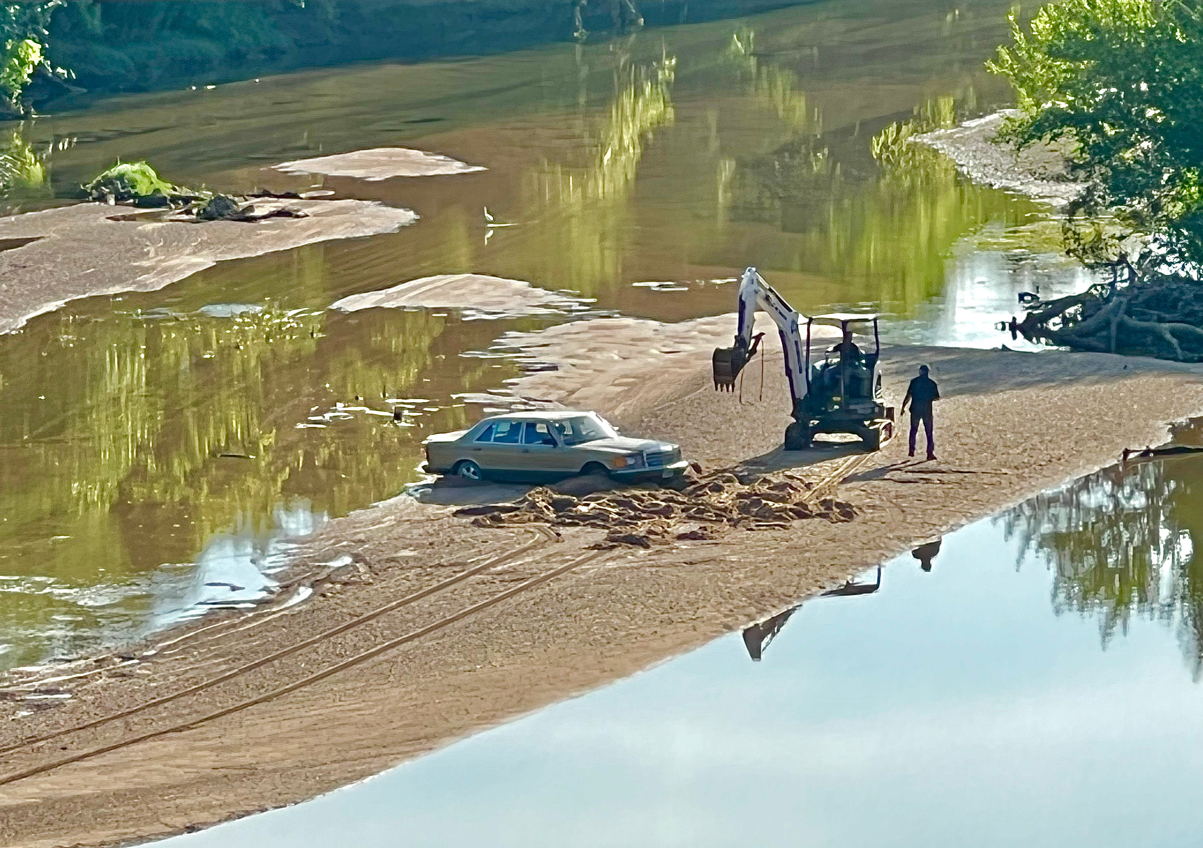 Thursday morning I saw two men trying to rescue a beached Mercedes at the edge of town. They were on a sandbar in the Colorado, below the overpass that connects north Austin with the airport. You couldn’t tell how the car had gotten there, at least not from the vantage I had up there on the old bridge that has been repurposed for pedestrian and bicycle use. The only visible tracks were of the backhoe that had driven out there shortly before I showed up, and was now poking around in the sand trying to figure out a viable extraction strategy. You also couldn’t tell if one of the guys was the owner of the car, trying to mitigate the damages of a wild Wednesday night, or if they were just an enterprising pair practicing the long Texas tradition of taking whatever bounty nature offers, by whatever means available.