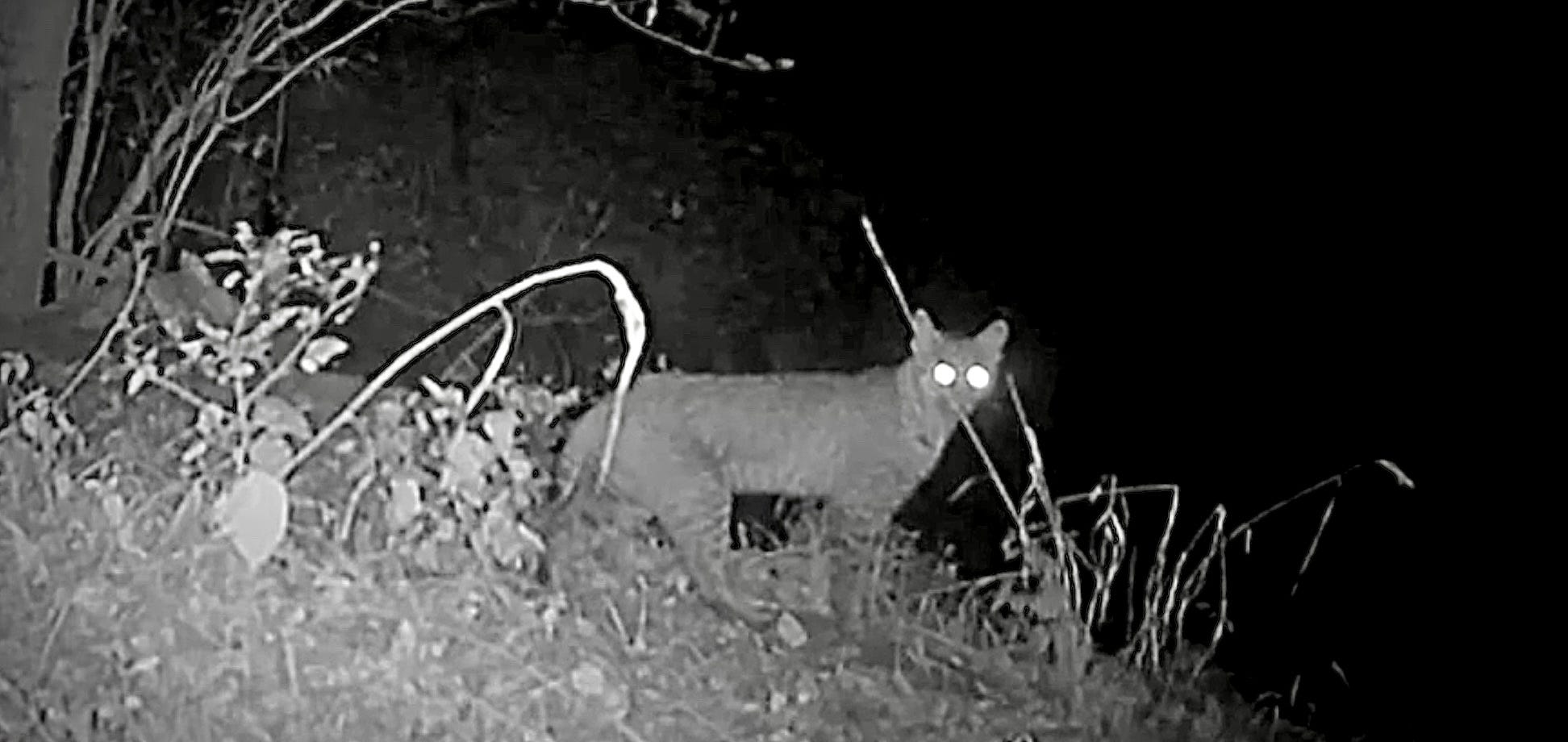 Here’s the real thing, on the prowl in the woods behind the industrial park we live next to, as captured on one of our trailcams in October 2020.