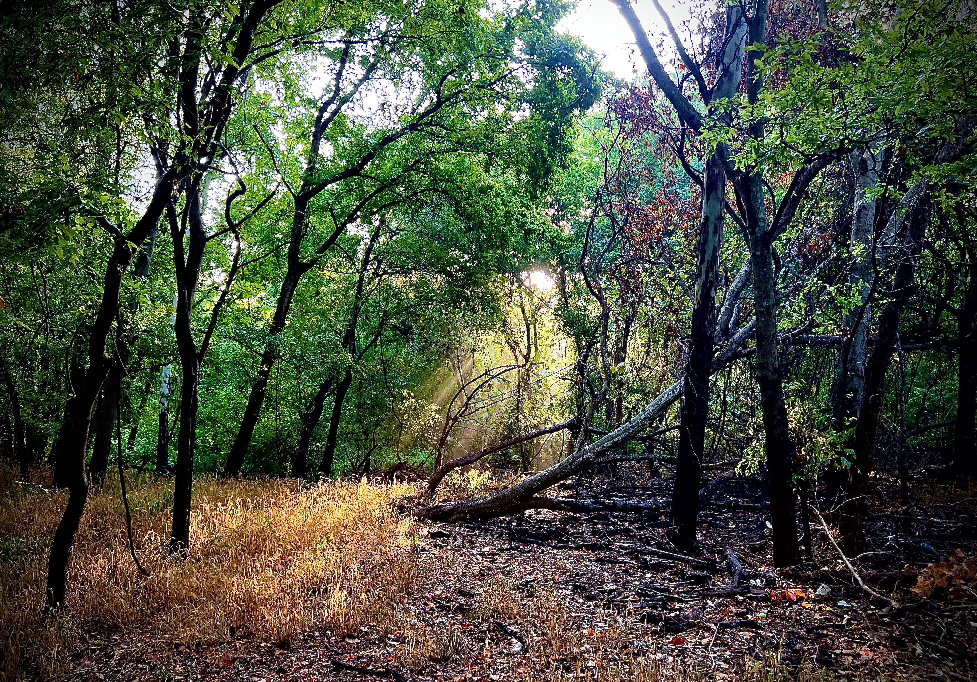 As we headed home, walking carefully to avoid tripping over any of the trash or tree fall that littered the forest floor and bringing our Master/Blaster set up crashing to the ground, we came upon a little grove where the tall cottonwoods and sycamores surround a spot that would make a great campsite. There’s a white plastic pylon back in there, almost as tall as me, that once marked the swim area of some highland lake. As we passed through the far edge of it, the morning sun was casting its rays through the canopy. Almost corny in its greeting card evocation of the divine, but a welcome reminder, both of the persistent possibility of reprieve, and the certainty that the summer sun will never really go away.