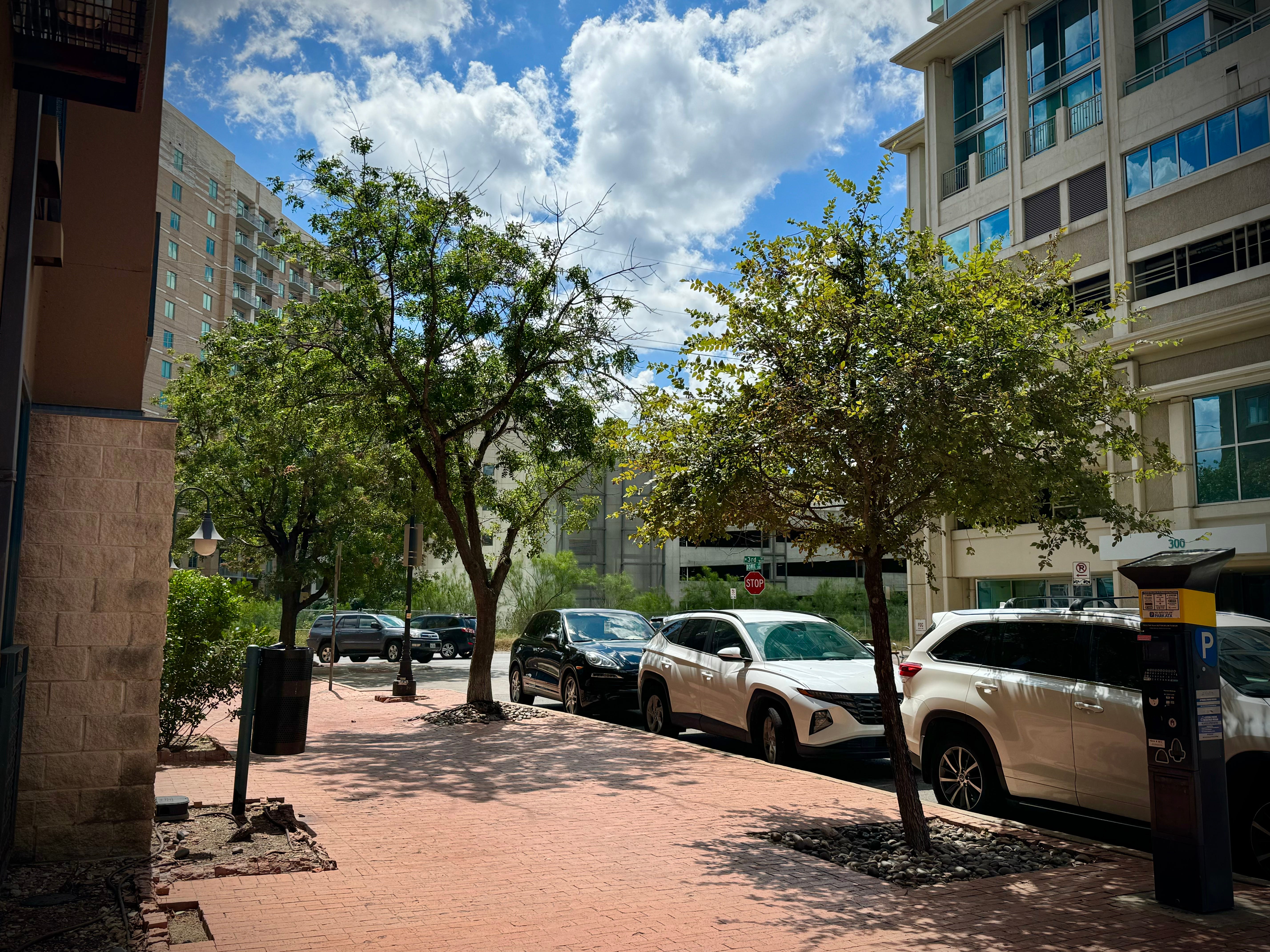 Sure enough, there was a nest. Or had been. There was a mama bird there, on an interior branch of the landscaper tree in the center of the photo above. A mourning dove, one of our most common year-round birds. What was left of the nest could be seen dangling beneath her pointed tail—a few curved bits of grass and twig. The rest, I saw, was there on the ground. The warm gusts of wind that blew through that corridor between high-rises explained the most likely cause. As did the Texas Parks & Wildlife Department’s online entry on the bird: