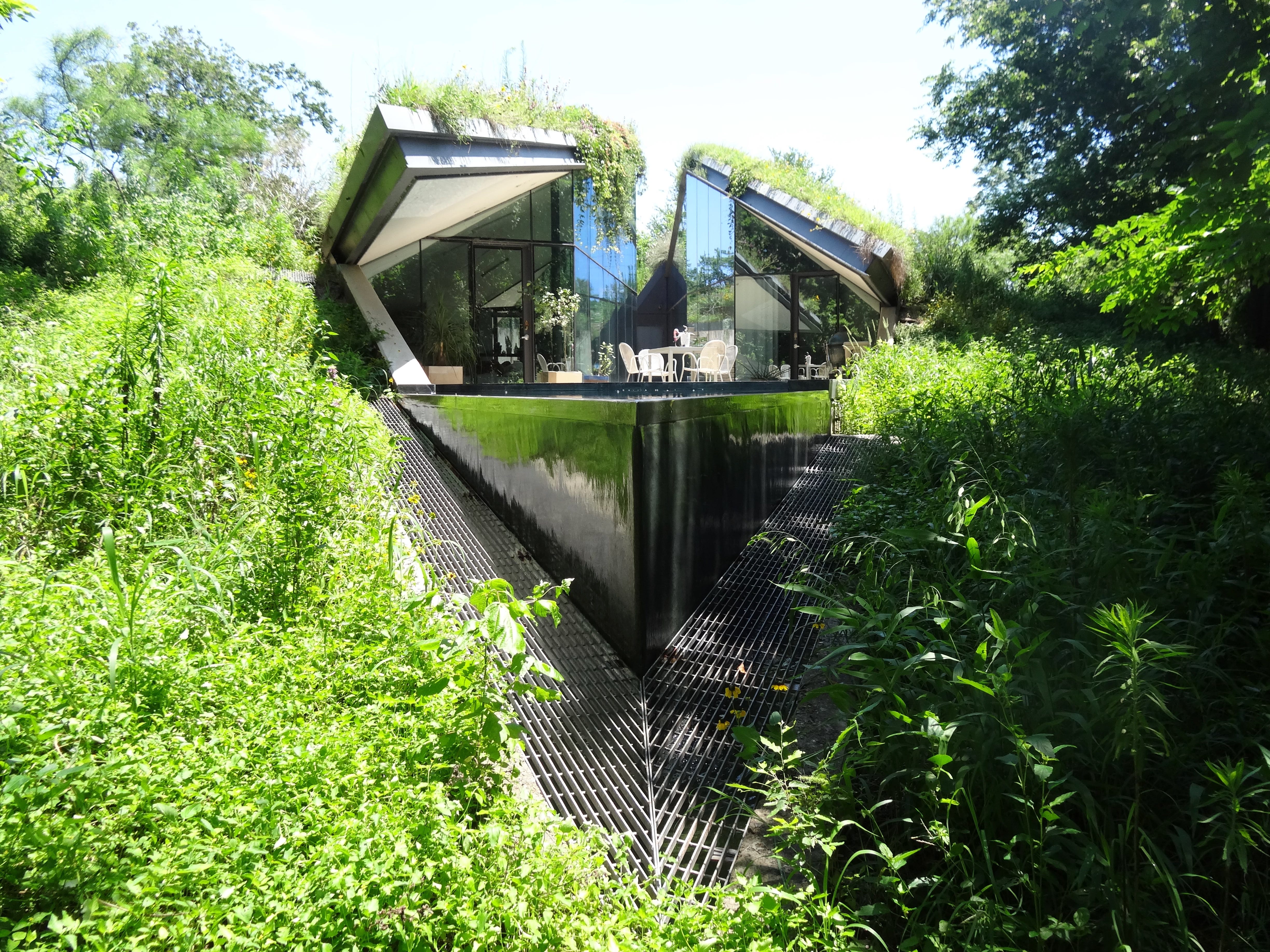 The house, built in the ditch where a petroleum pipeline once ran, and then covered with a green roof comprised of seventy-some species of native grasses and wildflowers, functions a bit like an inverse terrarium, in which the humans are inside, watching the wild pageant unfolding through the glass. And every spring for the last dozen years, since the vines started growing down over the glass, some of the neighborhood cardinals have built their nests in those vines. We see them busily construct them, watch them tend and feed their progeny, and have even seen the fledglings take their first flight.