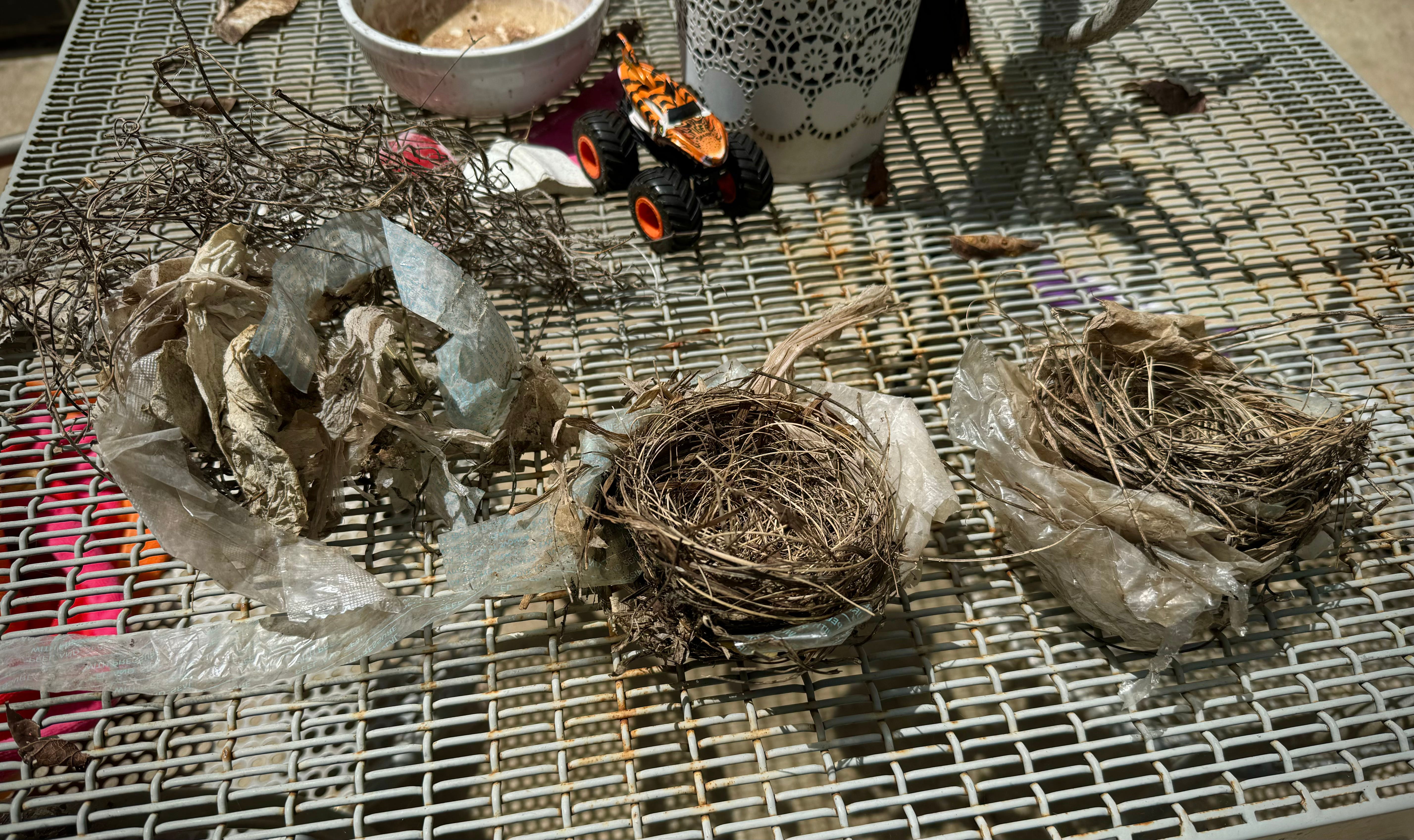 The nests don’t generally get re-used, and eventually they fall to the patio. That’s when you see that every single one of them includes layers of human-made synthetics, mostly packaging materials—fragments of open-cell foam, discarded food wrappers, bits of paper. Two of this season’s trio included long strands of the plastic backing from rolls of tape, printed with handy instructions that repeated over and over along the length of the ribbons embedded in the coiled mat of bird-manipulated grass: