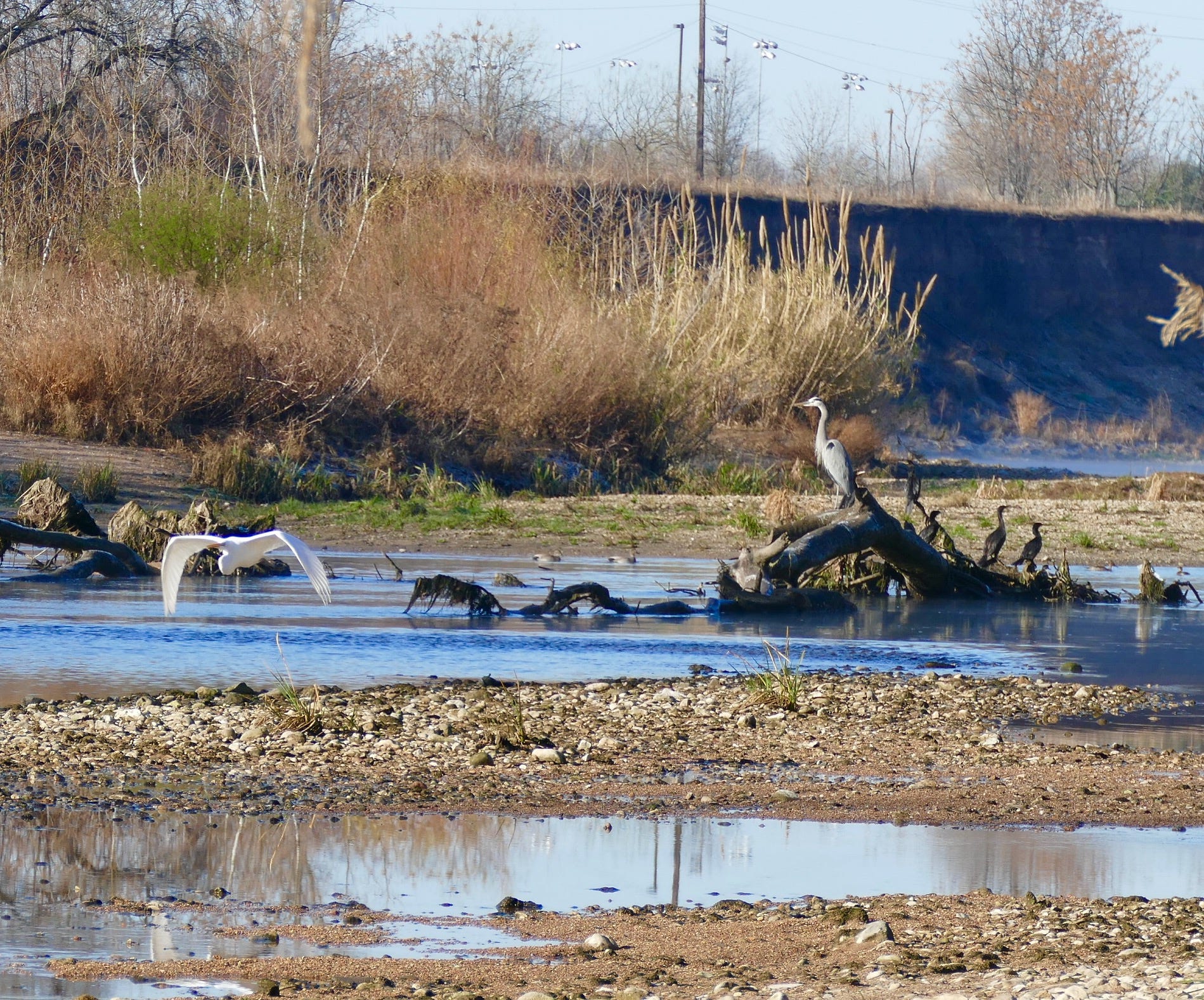 There were a lot of wild tires along the river, some of them in it, so old that you wondered if they could become fossils. On the rocky beach where they used to dredge gravel for the aggregate plants, you could see the bluebonnets starting to come up, winter hardies coated in a frost they would soon drink up, telegraphing the persistence of spring even on disturbed land.