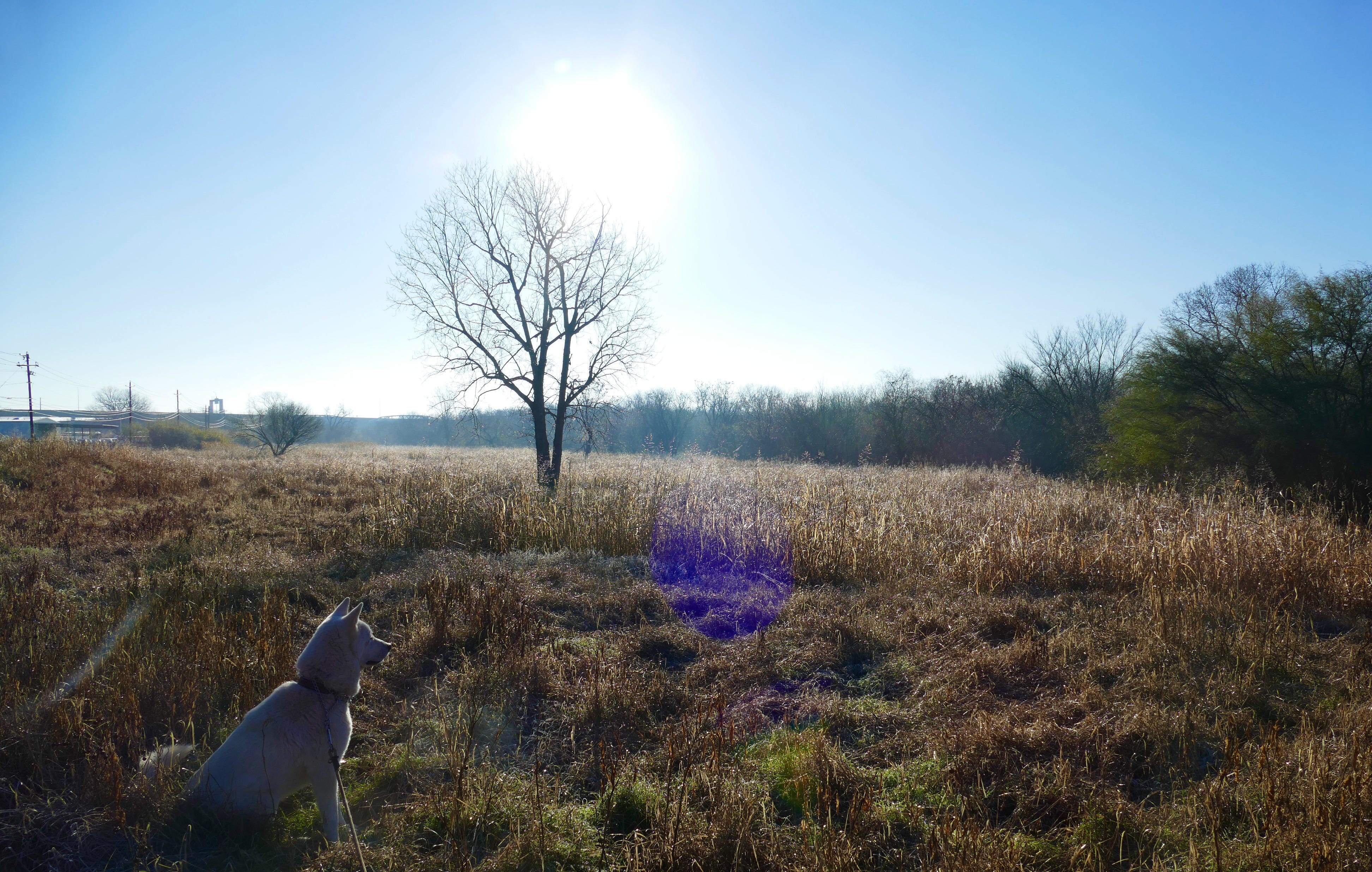 The sun was just getting above the treetops when we set out, headed east through the woods behind the door factory. We flushed a mob of whitetail, which the dogs smelled but only I saw. They were distracted by a new den they found, dug into the dirt at the edge of an erosion control gabion. We found more deer a little further on, scattering down into the floodplain, and I spotted what I thought was another up above us, in the old right of way. Then I saw its backlit silhouette running through the trees along the drainage ditch behind the construction supply warehouse, the one with the old TV wrapped up in the roots of a hackberry, and I realized it was a dog. A big one, on the loose.
