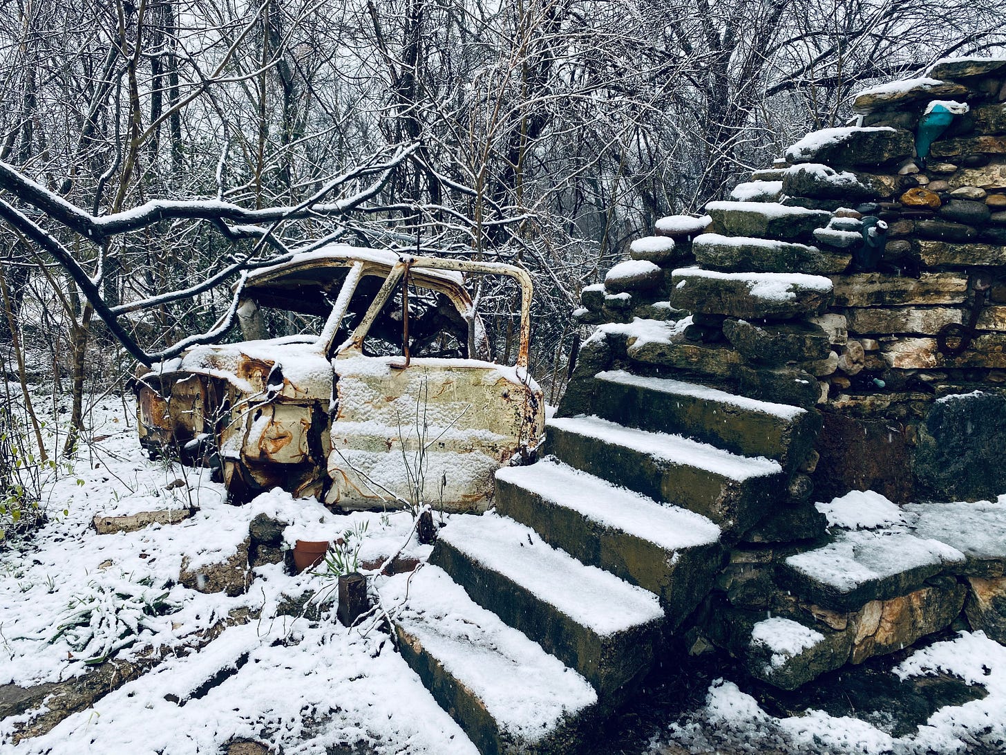 As we walked back toward home, we came upon one last little dump of snow, on some fragment of linoleum tile the floodwaters had left at the base of a big hackberry. In the picture I took, there’s a rainbow I didn’t see when I was there, like some hidden spirit. It made me wonder what the Druids would make of the trees that grow through our trash.
