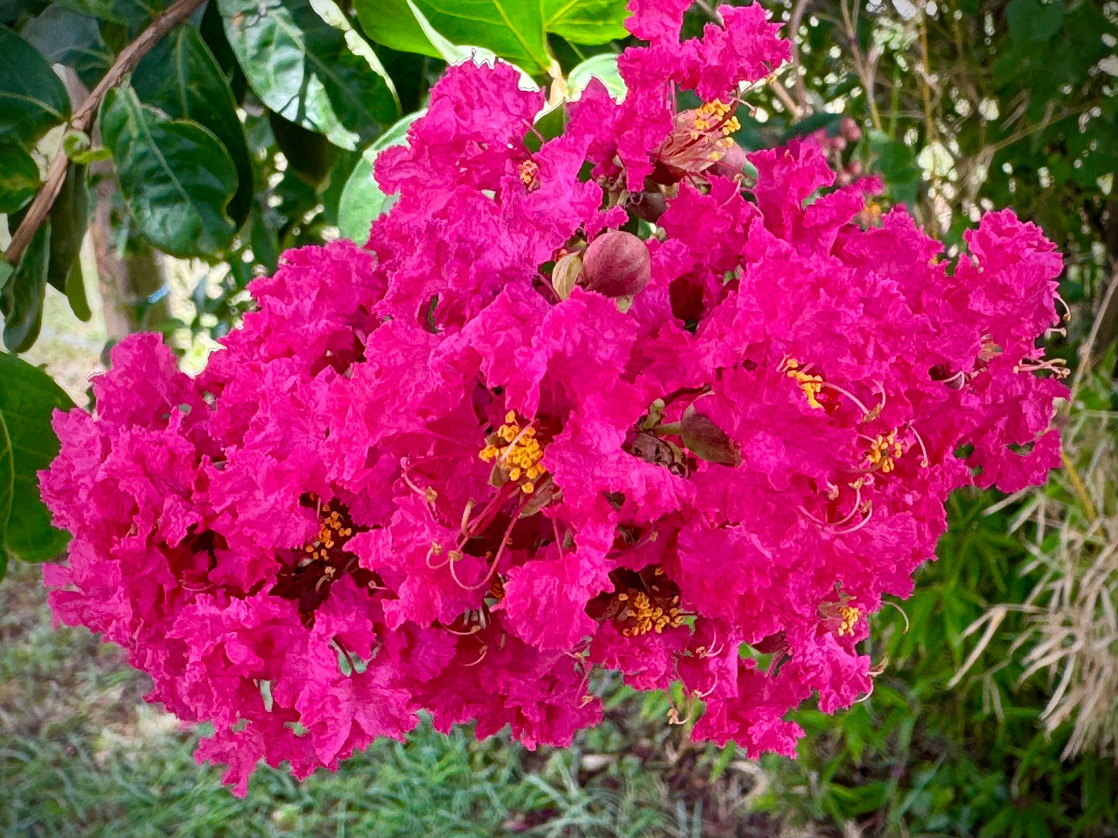 Earlier in the week, cooling down after a mid-day run into that zone behind the storage locker, I admired the stand of crape myrtles in bloom around the Amtrak station, a short block from the Treaty Oak. A tree whose fuchsia blossoms, one learns over time, appear at the same time as the peak summer heat, a heat that feels more intense every year. When I got closer, I was surprised by how little life their fresh blooms attracted—I know how many bees and butterflies there are around there, including on the earlier-blooming wildflowers that cover the adjacent hill. I had forgotten that our official state shrub is an exotic, native to China and Korea. And I wondered if it might ultimately be better adapted to the overheated milieu we have made, an exemplar of the immanent transecology that characterizes our environmental moment.