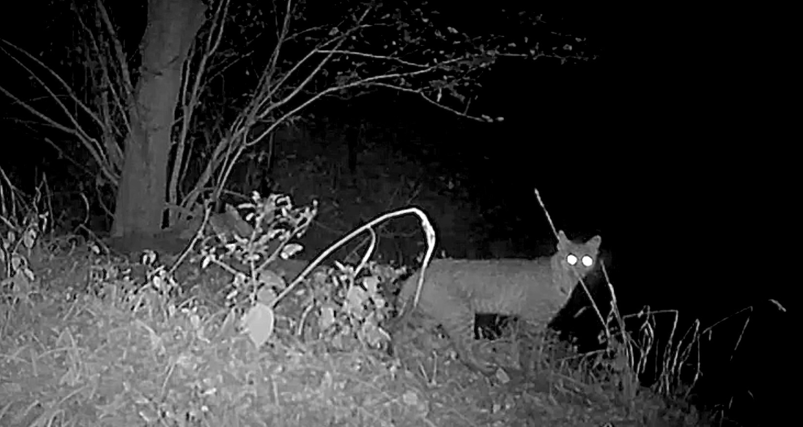 The full 10-second video is below, including a long pause as the cat stops to vogue. Note the striping along the forelegs, the subtle cocks of the ear (the acoustic capabilities of which are aided by the hair tufts), and the stubby little tail that moves like some alien antenna. That “bobbed” tail is how Lynx rufus earned its common name. If you turn on the sound, you may appreciate how silent its steps are, a stealthy contrast with the leaf-crunching coyotes.