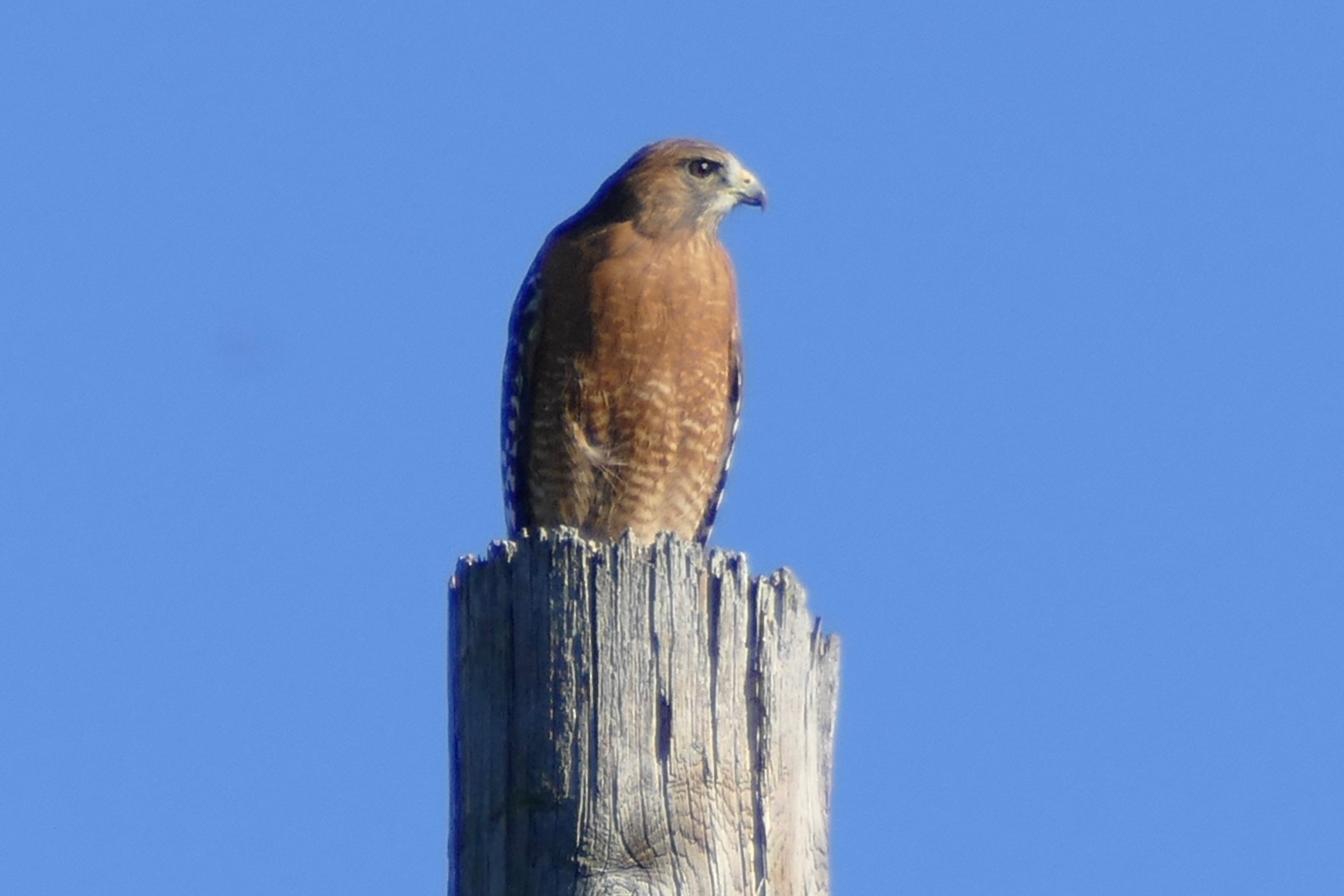 As a bonus for those who made it to the end, here’s the red-shouldered hawk I found staring at me from the Time-Warner pole Saturday evening when I stepped out for my last break before posting this: