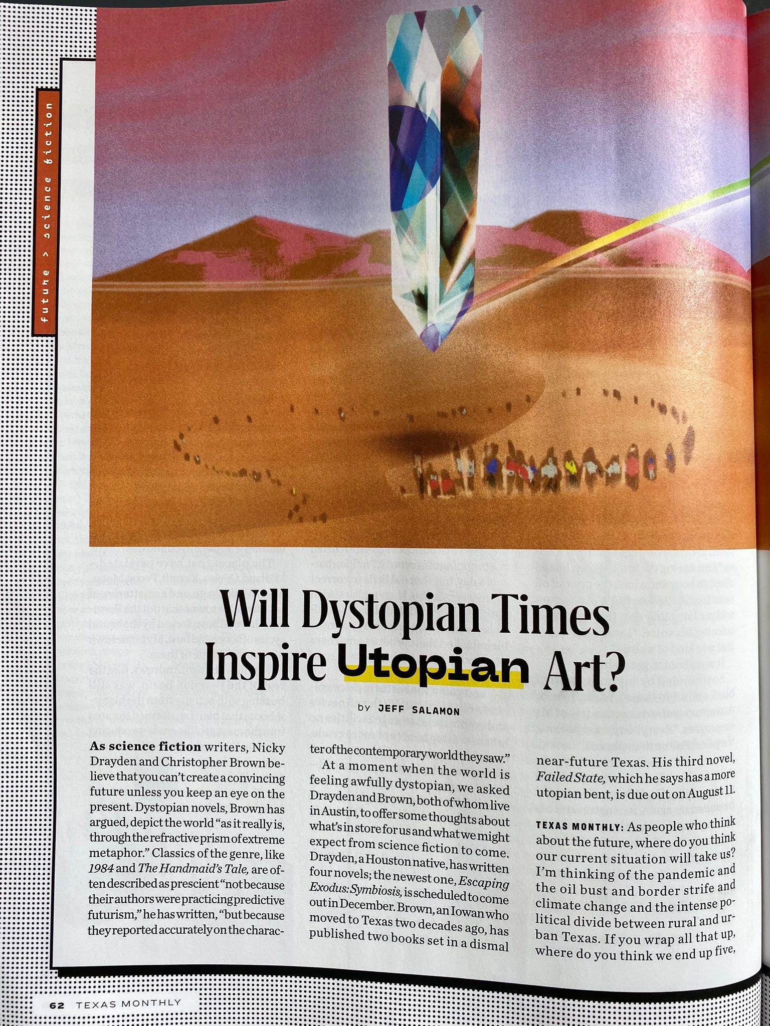 The new Texas Monthly arrived in the mail as I was writing this post: a futures-themed issue that includes a short interview my friend and fellow Austin-based SF writer Nicky Drayden did a little while back. The headline they came up with is pretty great, and the graphic is as groovy as a ‘70s Dune paperback cover: