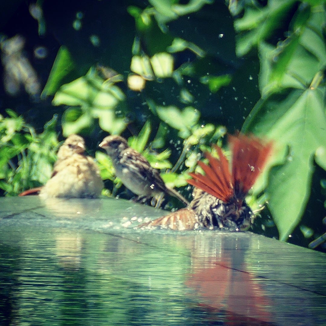 Songbirds of all ages love to bathe in our chlorine-free pool, which is surrounded by trees and green roof forms, and has a negative edge that provides a perfect shallow platform and the additional enticement of the sound of running water. And once in a while, they throw a teen bird pool party.