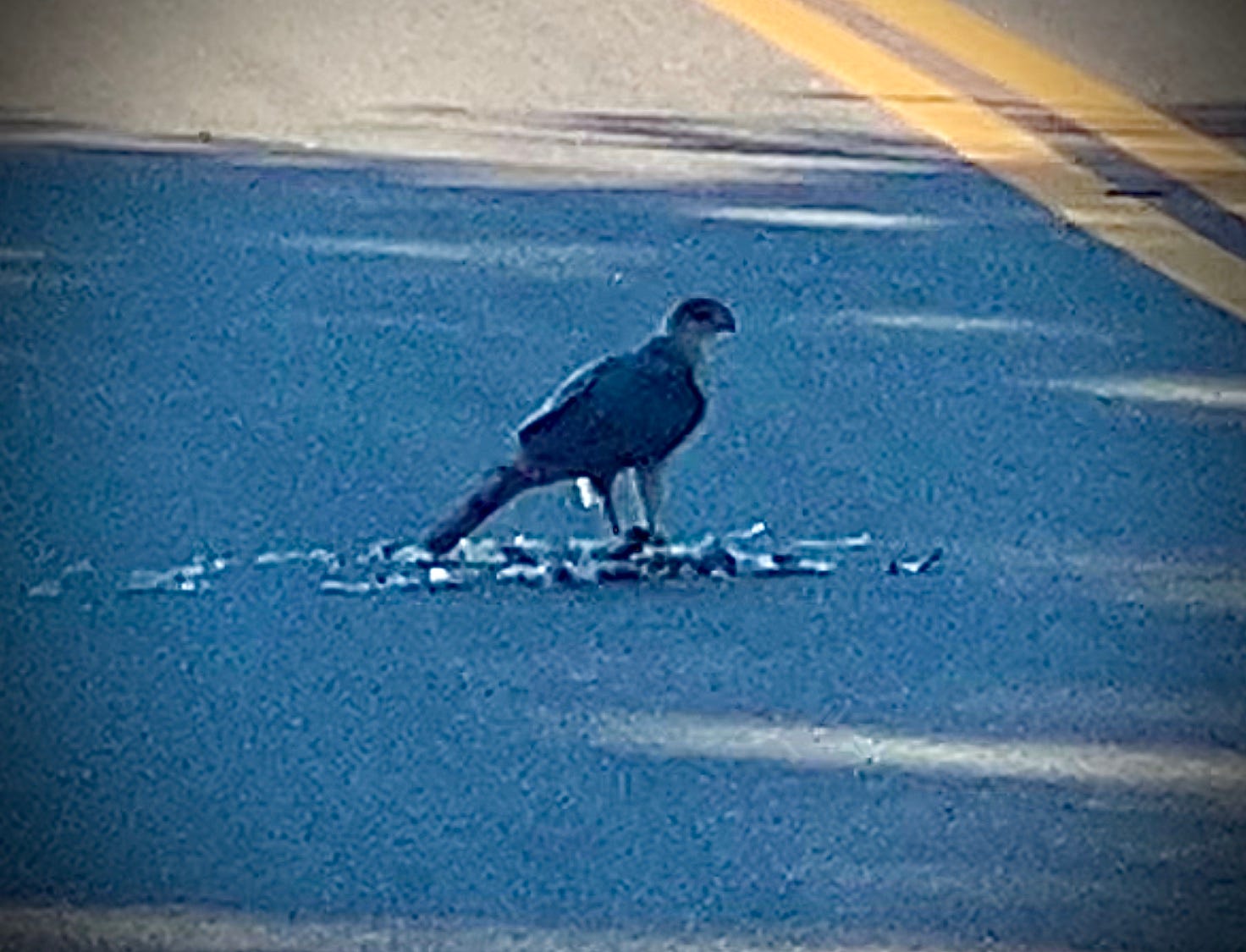 The city re-paved and restriped our street recently, providing some of our neighbors with a better reason to break out the roller skates as balletic quarantainment. It also provides a slightly improved palette to spot the urban wildlife action. And as we walked the long block on our return, we saw this little raptor enjoying its fresh kill in the middle of the road I have seen this bird before, I think, in this general vicinity, but never for long enough to make a good i.d. It’s usually before the light is really out, on those days when I walk the dogs before sunrise, and you can just catch that striking silhouette diving from the power line to surprise some rambling rodent. From those sightings I had guessed some kind of kestrel, but now I am pretty sure it’s a broad-winged hawk.