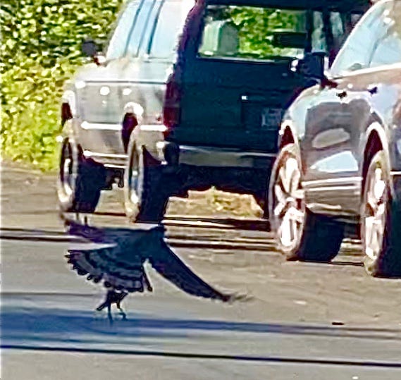 When we saw it Sunday morning it was in a shadow in the middle of the road, right by the double yellow lines, pulling tendrils of meat from a fresh carcass the way raptors do, rough surgeons of beak and claw. This was not far from the spot where a turtle that was fresh roadkill two weeks ago has been slowly disintegrating under the steady grind of June heat and overriding truck tires, relic of an adventurous egg-laying mission gone bad. As we approached, the hawk finally took off, carrying its prey into one of the trees in our neighbors’ front yard. You could see from the feathers that the prey was another bird, probably a mockingbird judging from the coloration. And when I zoomed in the above phone photo, those dangling talons told the story more clearly.