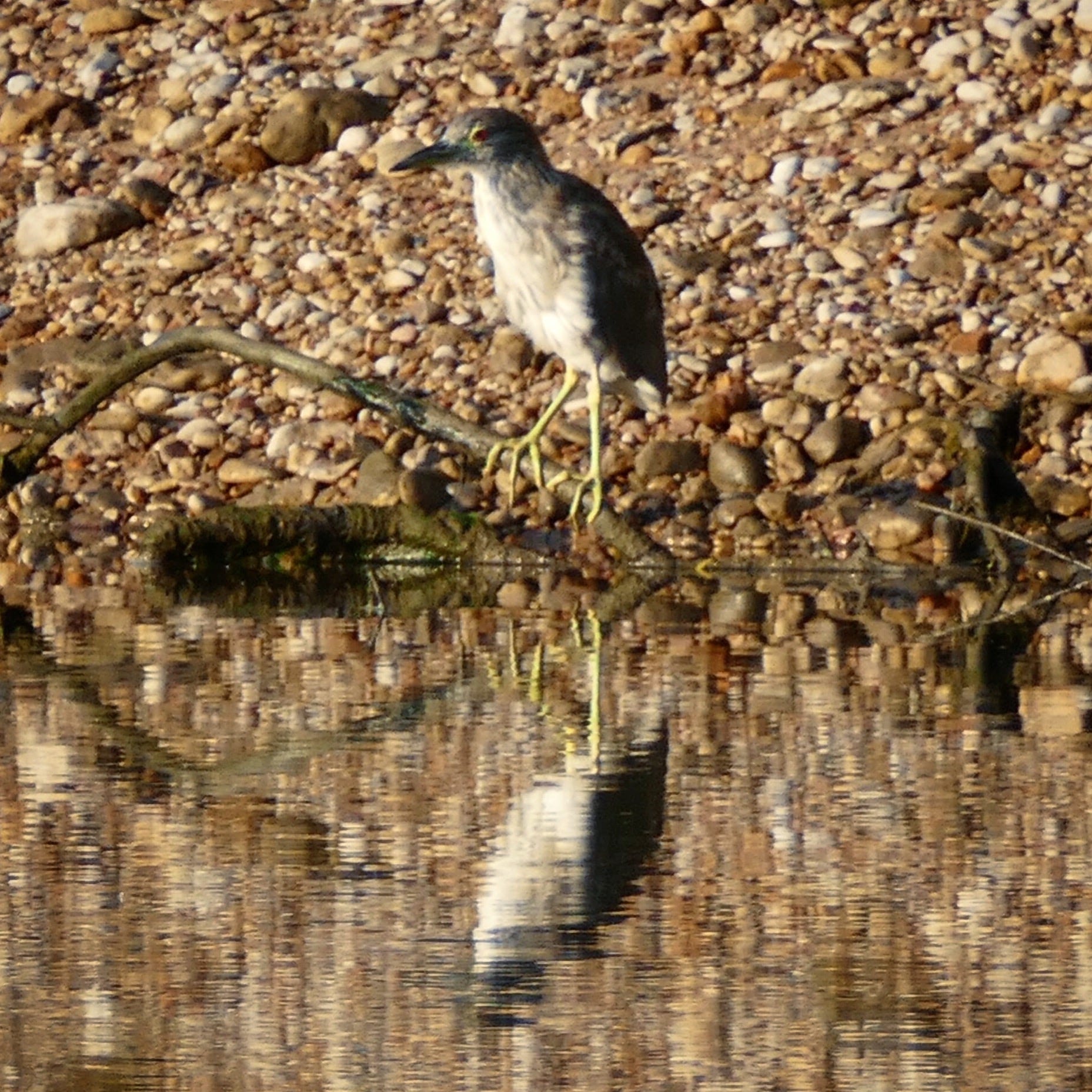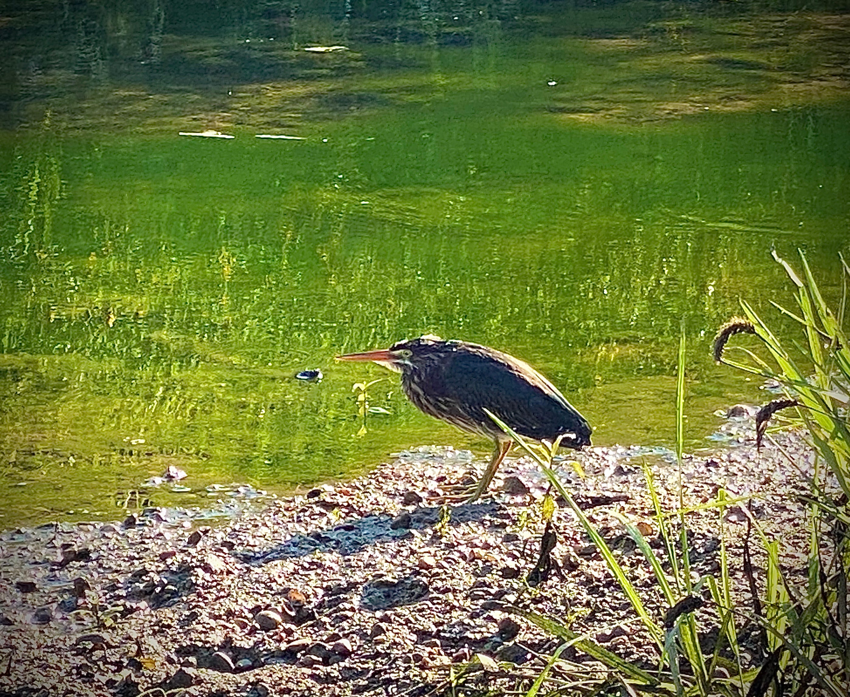 Monday morning baby and I walked down to the river and came upon this juvenile green heron chilling by a little backwater where they used to dredge gravel. I think it was a green heron—juveniles are always challenging to identify. Unless, like the first spring male summer tanager I wrote about here a few weeks ago, they are so spectacularly plumed as to rate an illustrated footnote in the guides.