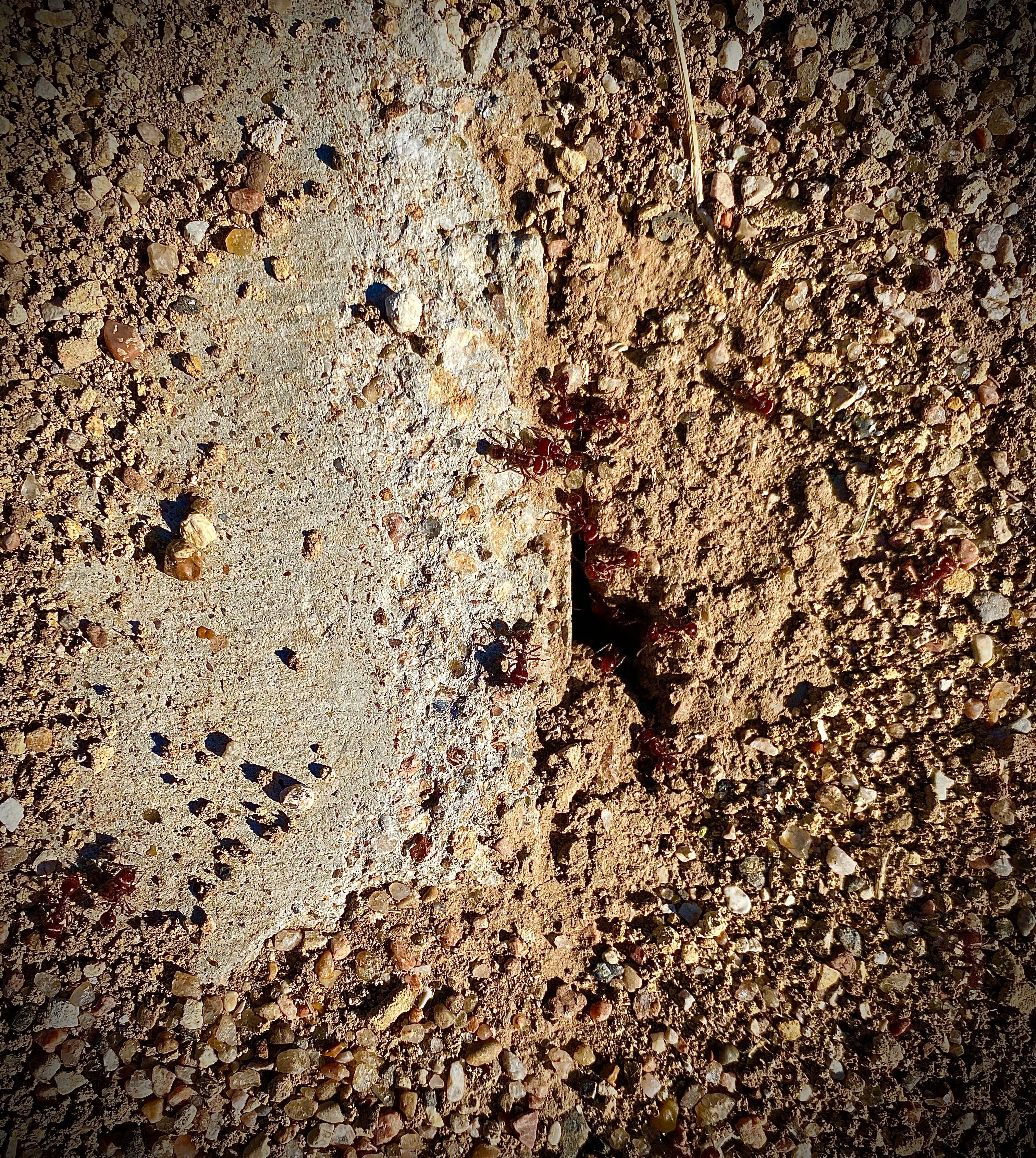 They ended up just burying the ants in enough dirt that they could work around them. And when the architects got their crew out to build our little house in the trench left by the pipeline excavation, they did the same thing. We figured the ants had been exterminated, which was a bummer, though there were many colonies nearby. But then the spring after we moved in, they reappeared, right at the top of our entry stairs. The same spot where the valve box had been, using the concrete structure instead of the steel walls. An inconvenient location for the humans, as we had to navigate around them every time we came or went, but their resilience made them all the more charismatic and weirdly welcome. No matter what “the Orkin Man” says.