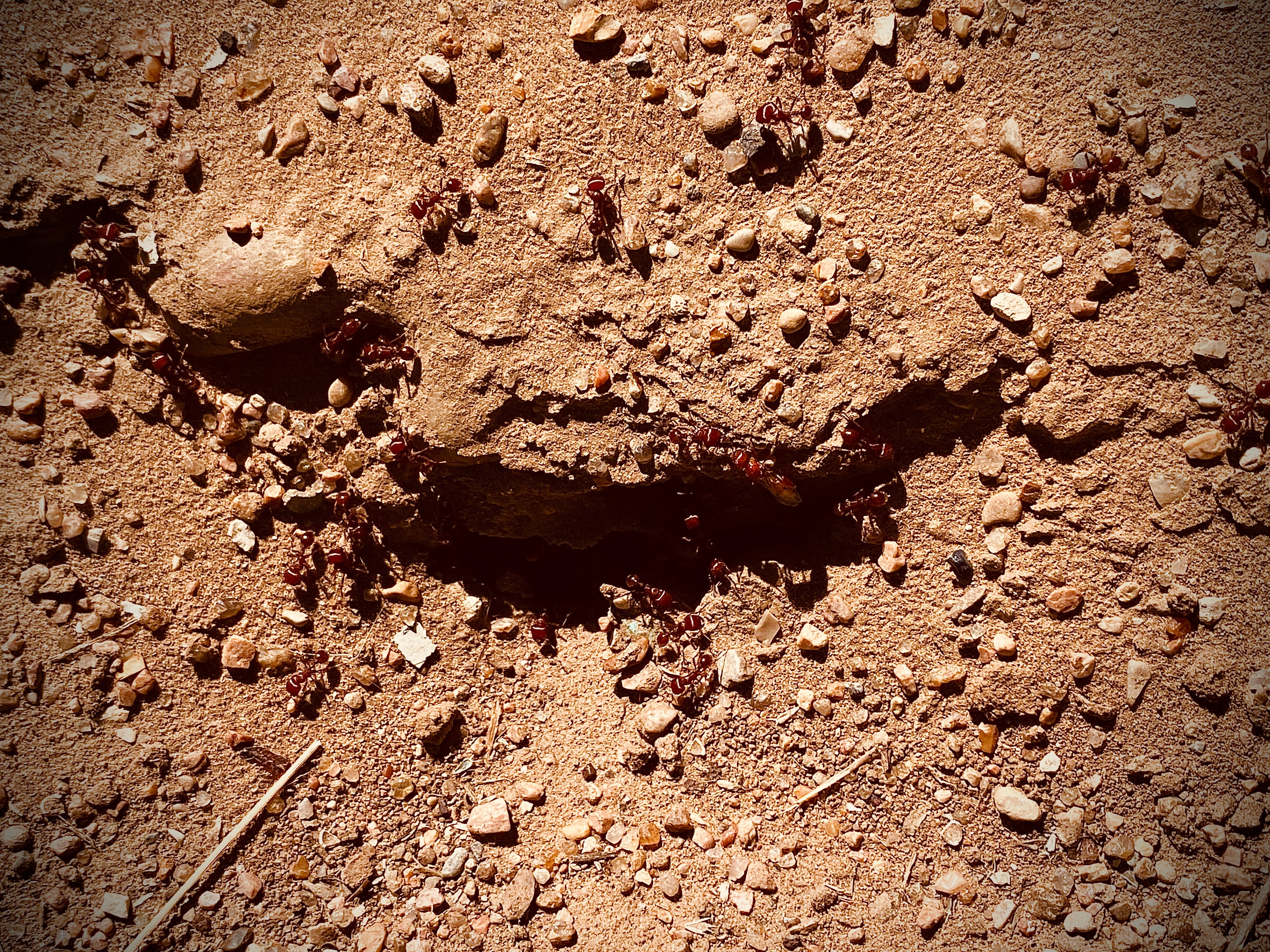 They were big ants, colored a very Texan reddish brown, and if you managed to get bitten by one you would learn how much more strong and venomous they were than the neighboring fire ants. My son, then a middle school nature nerd, was especially fascinated by them, and we spent fair chunks of our Saturdays observing their behavior, watching how quickly they would remove any little bit of vegetation that might land in their zone. Our neighbor, an entomologist who also admired the ants, said the nest probably went sixteen feet down, and could have numbered more than a hundred-thousand inhabitants. A myrmecological metropolis.