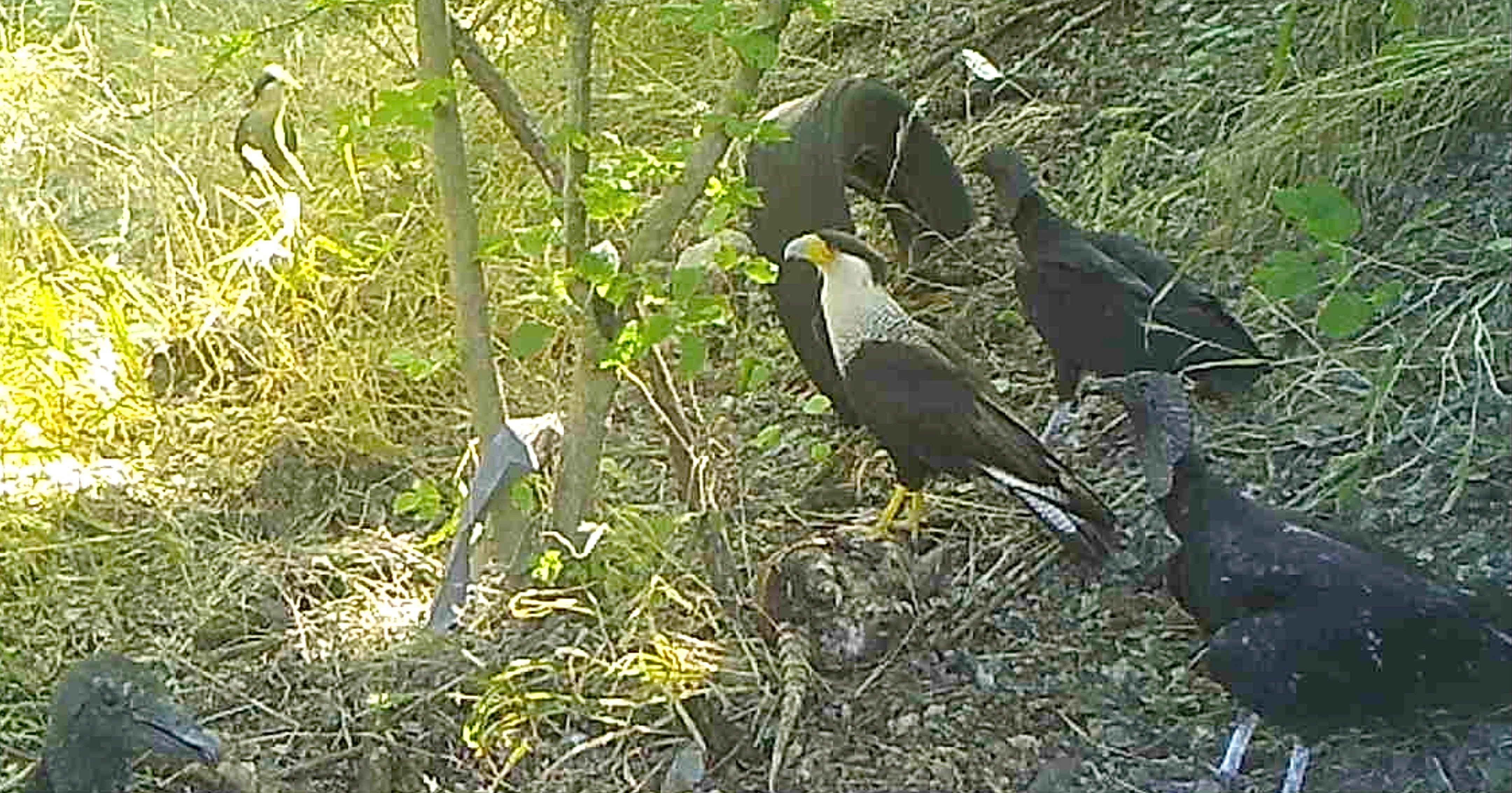 The more social black vultures came next, followed by a pair of crested caracaras. Sometimes I see a single caracara on a telephone pole or cell phone tower with a committee of black vultures, and they always look a little ridiculous in that company, acting as if they fit in. But I guess they have figured out that hanging with vultures is an easier way to get the food someone else already killed. In this case, the caracara spent a few minutes strutting around cockily and checking the scene out. Then finally one of them went in and contested the dominant vulture for control of the carcass. On the video, it looks like the caracara wins, but when you look at the frame-by-frame, you can see the vulture gets it on its back and dominates it, no matter how cool it tries to look. In the subsequent minutes, the caracaras get crowded out by the vultures, and split.