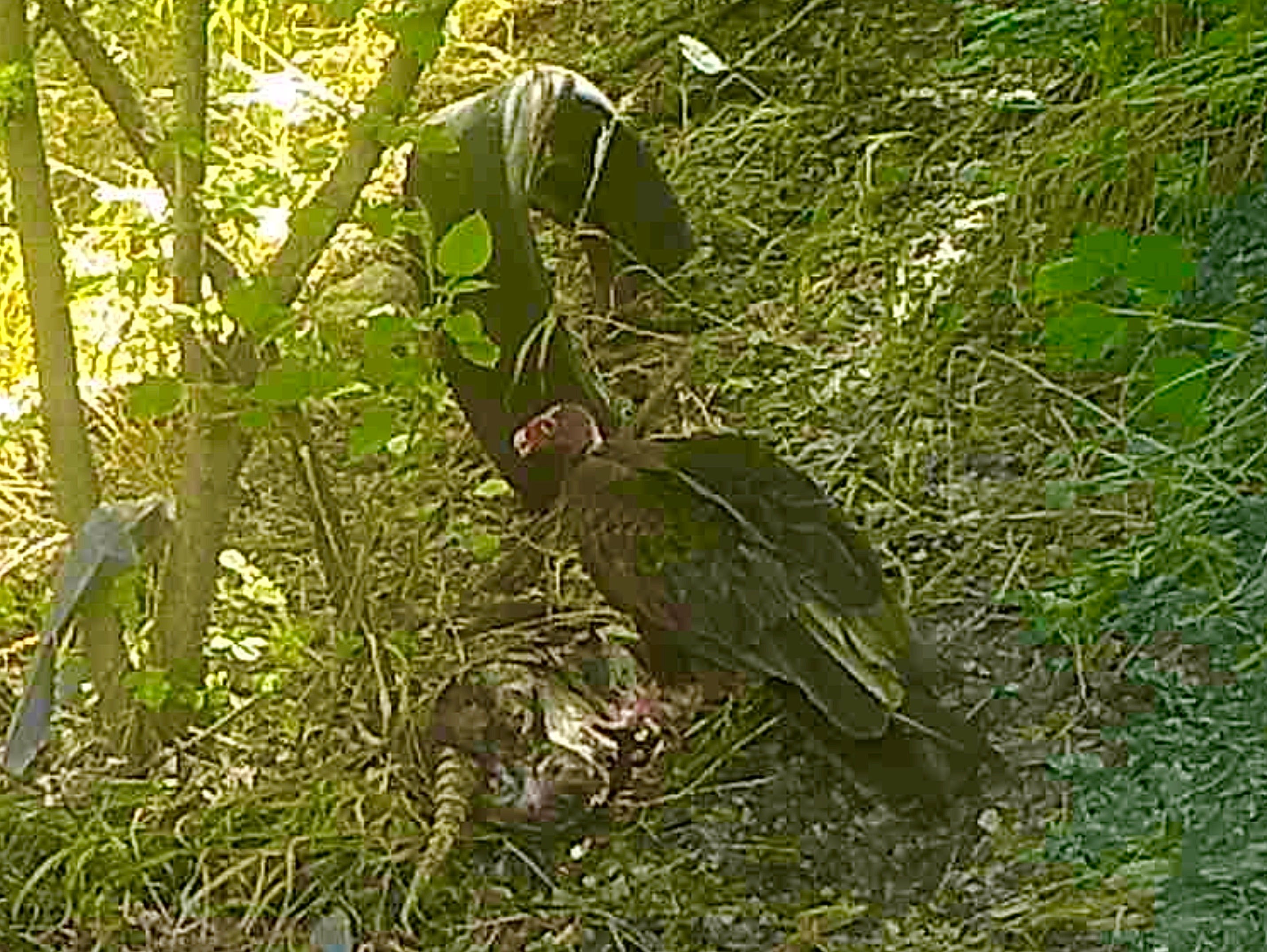And just like they say, the first scavenger to appear was a solitary turkey vulture, shoving its head in there with gusto.